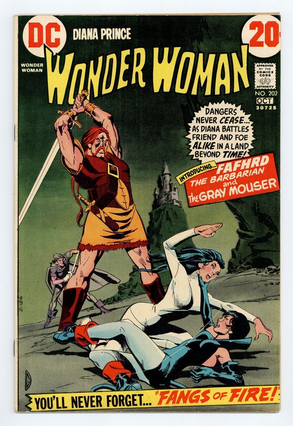Starts May 11 Cover by Dick Giordano. First full comic book appearance of Fafhrd and Grey Mouser in "Fangs of Fire," script by Samuel R. Delany, art by Dick Giordano; After a fight breaks out among Fafhrd and the Grey Mouser and Diana and Catwoman, I-Ching halts it by producing the Fist of Flame; He informs them that the Flame Fist has a sister jewel, the Eye of the Ocean (which Fafhrd and the Mouser had sought), and that one can look into one gem and see what is in front of the other; Diana looks into the gem and sees Jonny Doubles face; Jonny proves to be a prisoner of Lu Shan, I-Chings daughter, who has the Eye of the Ocean and seeks the Fist of Flame; when joined in a dimensional energy transfer matrix machine, the gems energies can pierce dimensions, which will enable Lu Shan to enter and loot Nehwon; Diana and I-Ching get transported to another dimension. 36 pages, Full Color. Cover price $0.20. Grade: VG 4.0 explanation of grade Condition: Used (collectible)