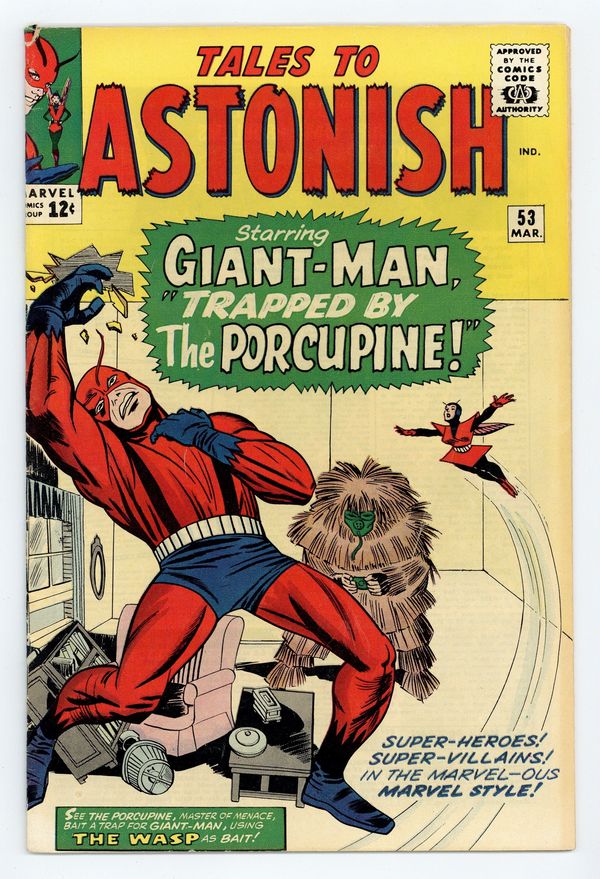 Starts May 18 Cover by Jack Kirby and Sol Brodsky. Trapped by the Porcupine!, script by Stan Lee, art by Dick Ayers; The Porcupine uses Giant-Man's fan club to attack him and then he captures the Wasp. The Clock text story. When Wakes the Colossus!, script by Stan Lee and Larry Lieber, art by Larry Lieber and Don Heck; An alien warlord builds a giant statue to intimidate the superstitious, but it comes to life and takes the side of the rebels against him. 36 pgs., full color. $0.12. Cover price $0.12. Grade: VG 4.0 explanation of grade Condition: Used (collectible)