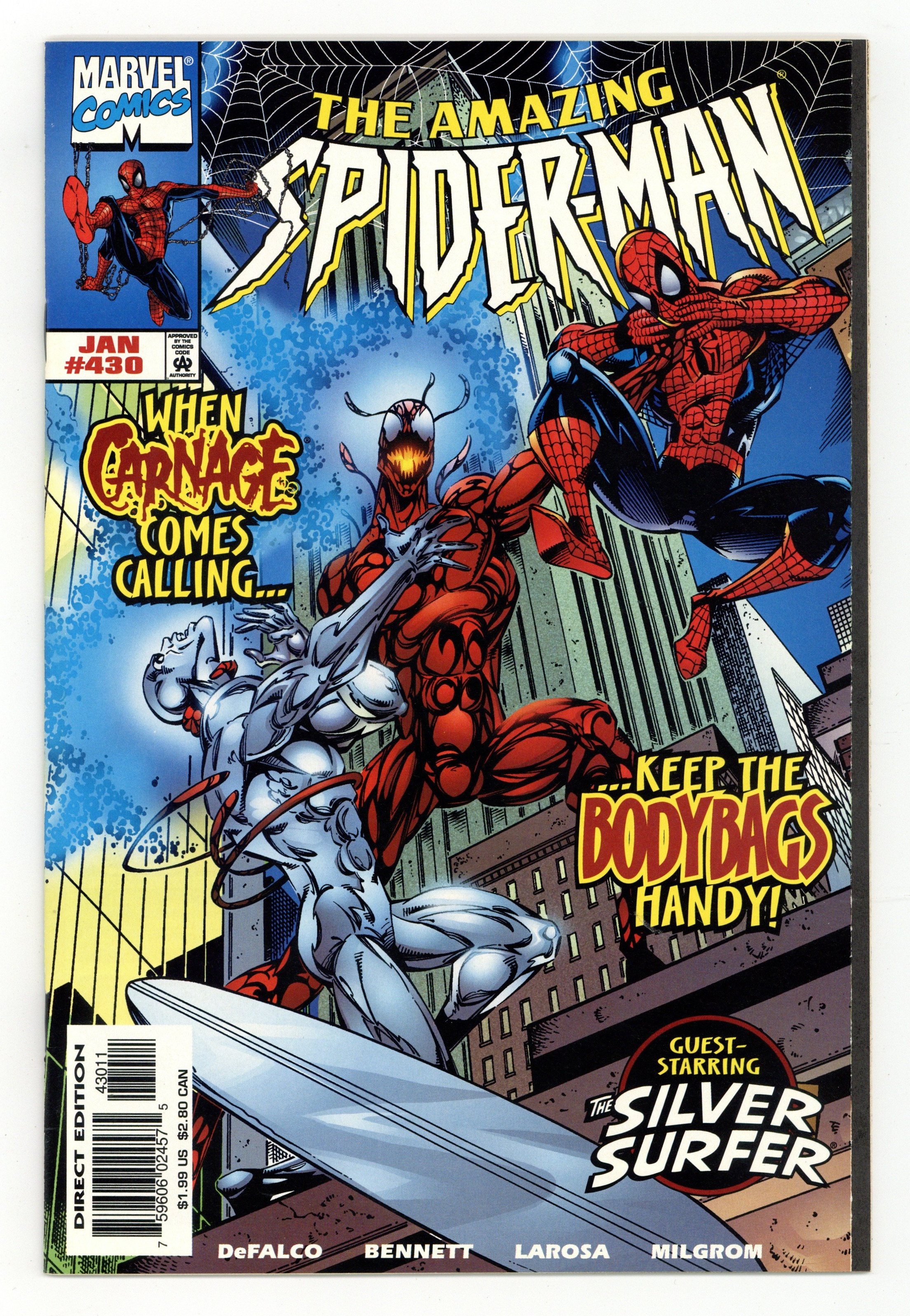 Starts May 11 Direct Edition. Cover pencils by Tom Lyle, inks by Bud LaRosa. Carnage and the Silver Surfer guest star in "Savage Rebirth!", script by Tom DeFalco, pencils by Joe Bennett, inks by Bud LaRosa; Spider-Man rejoices that the Avengers have been confirmed to be alive; He begins dealing with the one million dollar reward the Bugle has on him; He heads toward the Baxter Building to visit the Fantastic Four, only to remember that the Thunder Bolts recently purchased the building; Peter agrees to quit being Spider-Man, as Mary meets up with Jill; Dr. Ashley Kafka, the new director of the Ravencroft Institute wants to shut down the microwave field holding back Cletus Kasady in order to cut costs. Cameos by Captain America, Iron Man, and the Vision. 38 pgs., full color. $1.99. Cover price $1.99. Grade: VF- 7.5 explanation of grade Condition: Used (collectible)