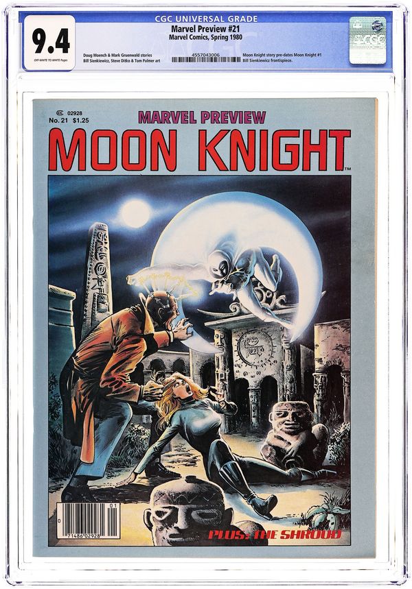Cover pencils by Bill Sienkiewicz, inks by Klaus Janson; Moon Knight illo by Sienkiewicz; Full Phase article by Ralph Macchio; The Mind Thieves Moon Knight story by Doug Moench, pencils by Sienkiewicz, inks by Tom Palmer, Sienkiewicz, and Dan Green; Vipers Moon Knight story by Moench, pencils by Sienkiewicz, inks by Tom Palmer, Sienkiewicz, and Dan Green; Laughing in the Dark article by Roger Stern; and Walk a Crooked Mile! story by Mark Gruenwald and Steven Grant, art by Steve Ditko. 68 pgs. Cover price $1.25. Grade: CGC 9.4 explanation of grade Condition: Used (collectible)