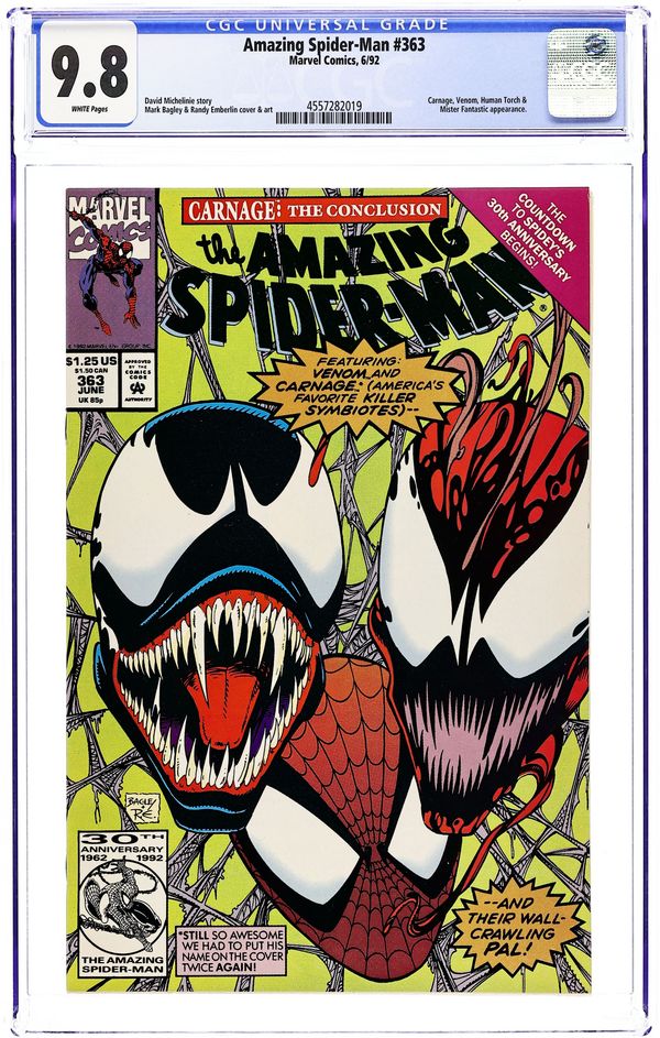 Direct Edition. "Savage Grace!" Part 3 of 3. Script by David Michelinie. Pencils by Mark Bagley. Inks by Randy Emberlin. Cover by Mark Bagley and Randy Emberlin. Carnage takes J. Jonah Jameson hostage and drags him to a heavy metal concert at Madison Square Garden! The psychotic killer plans to execute JJJ in front of thousands of headbangers! But before Carnage can deliver the deathblow, Spider-Man and Venom strike! The ferocious fight leads into the subway tunnels and then back onto the concert stage! Where thanks to MSG's awesome sound system, the web-slinger tries to knock out both Carnage and Venom! The wall-crawler's ploy better work, because double-crossing Venom could have lethal consequences! A fantastic finish! First appearances of the Richard Parker and Mary Parker life model decoys (LMD's). Cameo appearances by Joe Robertson, Mr. Fantastic, and the Human Torch. (Notes: Venom appears next in the one-shot: Spider-Man Special Edition -- The Trial of Venom (1992). Carnage returns in the first issue of Spider-Man Unlimited (1993 1st series) to kick off the Maximum Carnage saga.) 36 pages. $1.25 cover price. Cover price $1.25. Grade: CGC 9.8 explanation of grade Condition: Used (collectible)