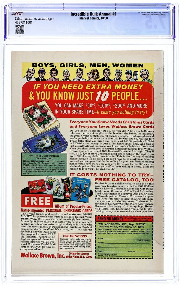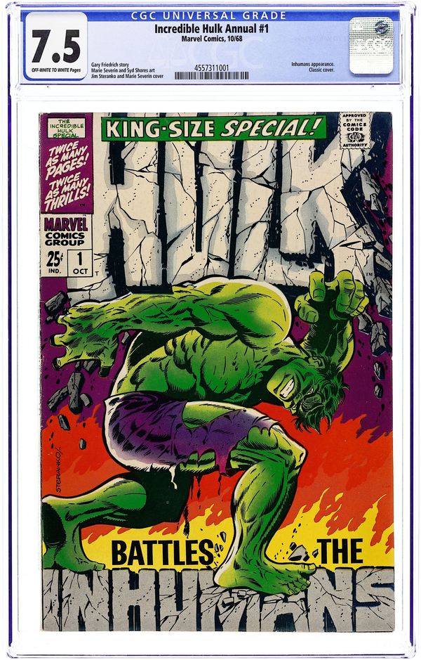 New story: the Hulk battles the Inhumans in "A Refuge Divided!" Script by Gary Friedrich, pencils by Marie Severin, inks by Syd Shores (and others). Jim Steranko cover (with the head redrawn by Severin). 68 pages, full color. Cover price $0.25. Grade: CGC 7.5 explanation of grade Condition: Used (collectible)