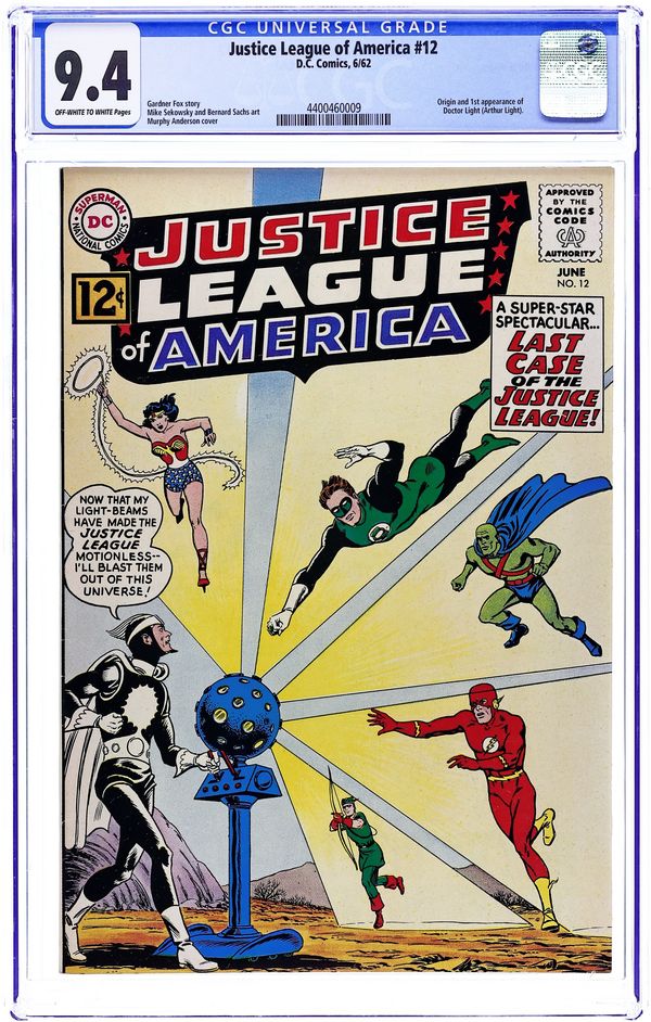 Origin and 1st appearance of Dr. Light. Cover art by Murphy Anderson. The Last Case of the Justice League!, script by Gardner Fox, pencils by Mike Sekowsky, inks by Bernard Sachs; Snapper Carr is summoned to the Justice League Sanctuary, only to find Dr. Light there; Light tells Snapper that he transported the rest of the Justice League to a surreal universe from which they can't escape. Once he's finished his tale, he freezes Snapper solid; But of course the Justice League saves the day. 36 pgs. $0.12. Cover price $0.12. Grade: CGC 9.4 explanation of grade Condition: Used (collectible)