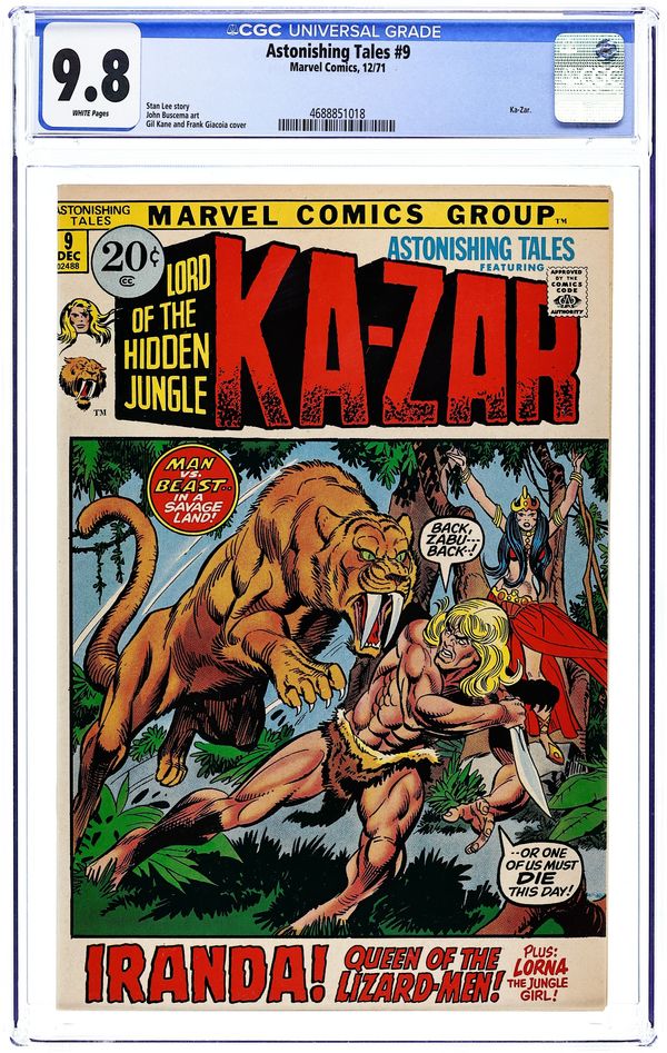 First 20-cent cover price. Cover pencils by Gil Kane, inks by Frank Giacoia. The Legend of the Lizard Men!, script by Stan Lee, art by John Buscema; When Ka-Zar goes in search of missing women and men from a local village, he finds the woman, Iranda and the Lizard Men. Tom-Toms of Danger!, script by Don Rico, art by Jay Scott Pike; Moki uses the sound of Tom-Tom's to drive all of the Gabu into a war frenzy so that he can take over the jungle. The Green Opal! starring Lorna, the Jungle Girl, script by Don Rico, art by Jay Scott Pike; Alexei and Subu surrender when The Green Opal warns them that if they dont stop abusing its name and power it will pursue them to the ends of the earth. Cover price $0.20. Grade: CGC 9.8 explanation of grade Condition: Used (collectible)