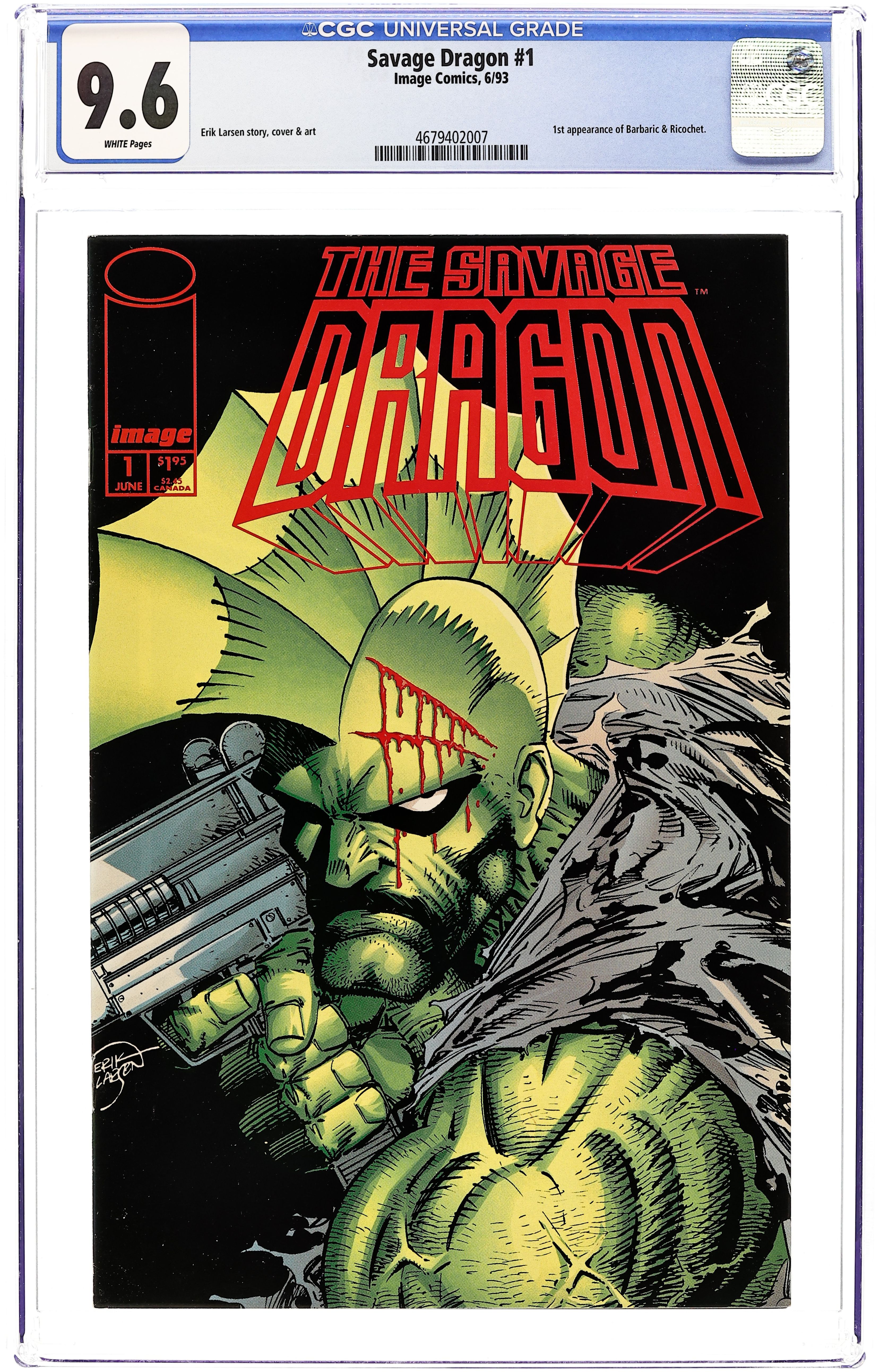 Starts May 18 "The Savage Dragon!" Story and art by Erik Larsen. In a city where the bad guys are bulletproof (literally), only one man has the power to fight back. Found in a burning field with no memory of his past, the Savage Dragon fights on the side of justice as an officer of the Chicago Police Department against the sinister mutants and super villains of the criminal organization known as the Vicious Circle. But in the startling aftermath of the his first series' event, the Dragon may not be in any shape to fight. 32 pages, FC. NOTE: 1st appearance of Barbaric and Ricochet. Cover price $1.95. Grade: CGC 9.6 explanation of grade Condition: Used (collectible)