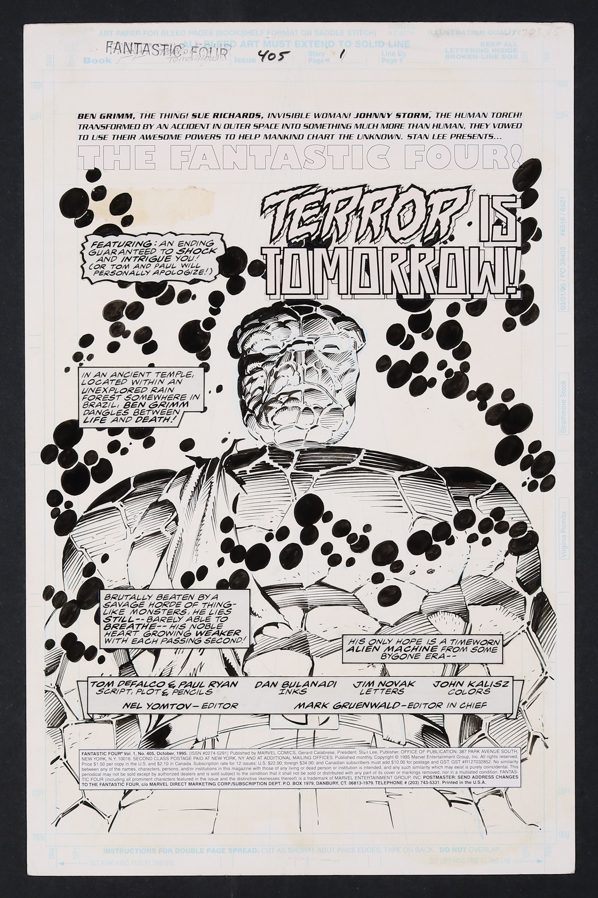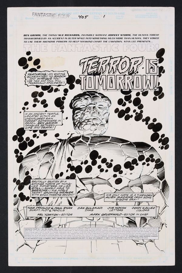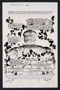 What a title page! An ancient temple in Brazil is found to hold a device which can turn people into Things and after defeating a group of mercenaries looking to use it for their own ends, team Fantastic decide to use it on the injured Ben who fought off a group Thing-ified mercs on his own. Will the machine heal Ben? Could it even restore him to his human form? Find out after a page turn, True Believer! Pencil and ink on Marvel Comics art board. 11" x 17 1/4". NOTE: One caption box ("Revealed At Last" The Sinister Secret of Boris!") is missing from the page.
