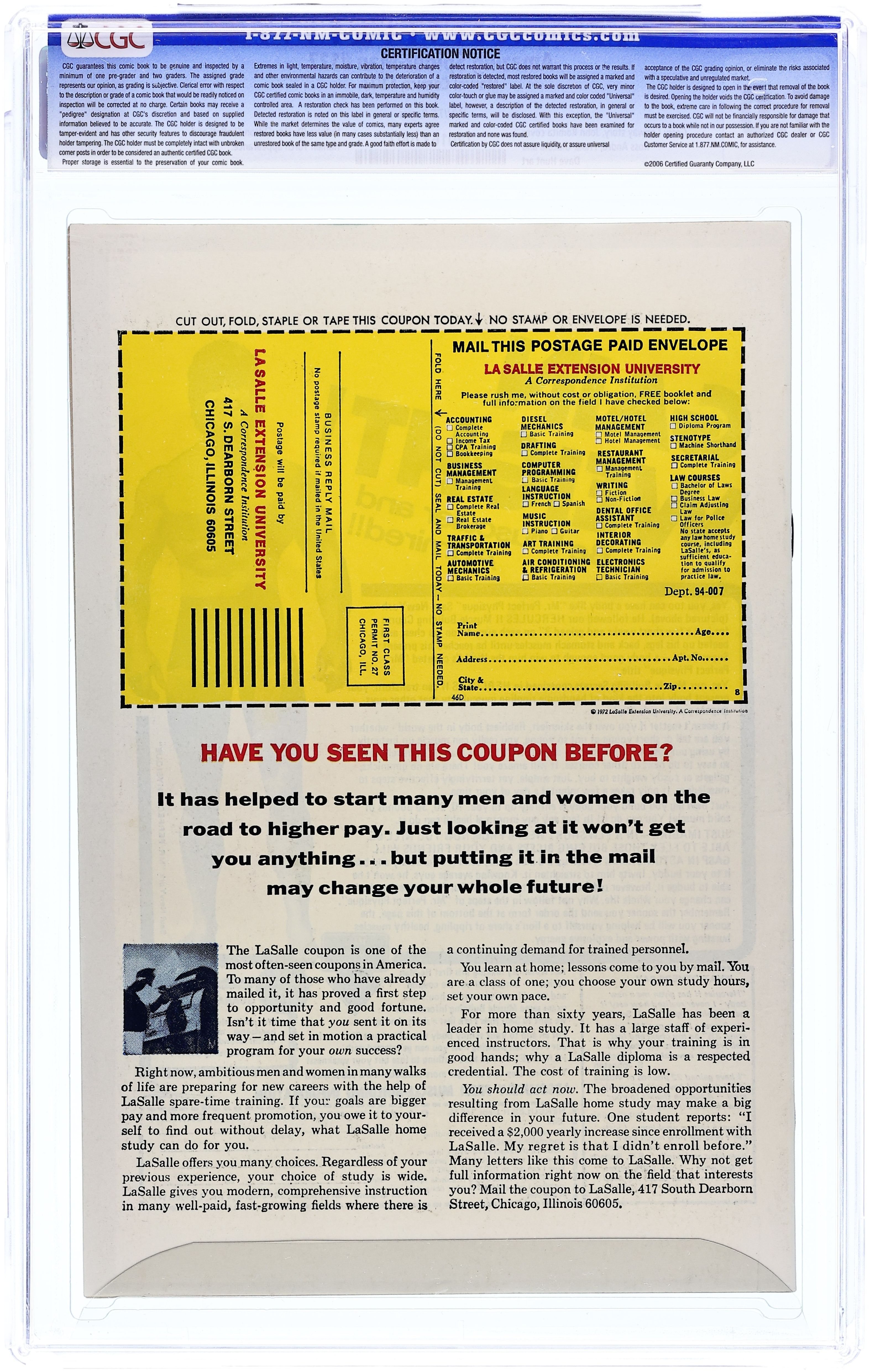 "The Dark Wings of Death!" Part 1 of 2. First appearance of the third Vulture. Script by Gerry Conway. Pencils by Ross Andru. Inks by Frank Giacoia and Dave Hunt. Cover by John Romita. Outside her apartment window, Mary Jane Watson witnesses a murder! And she thinks the killer is the Vulture! However MJ is reluctant to go to the police in fear of retaliation -- despite Peter's recommendation to do so. The next day at Empire State University, Mary Jane's worst fear is realized...when the Vulture grabs her! But the ESU campus is the stomping ground of your friendly neighborhood Spider-Man. And the next great fight between the web-slinger and the Vulture begins! First appearance of Dr. Clifton Shallot. Cameo appearances by the Human Torch, Professor Miles Warren, Flash Thompson, and Harry Osborn. (Note: This issue was reprinted in Marvel Tales 104.) 32 pages. Cover price $0.20. Grade: CGC 9.0 explanation of grade Condition: Used (collectible)