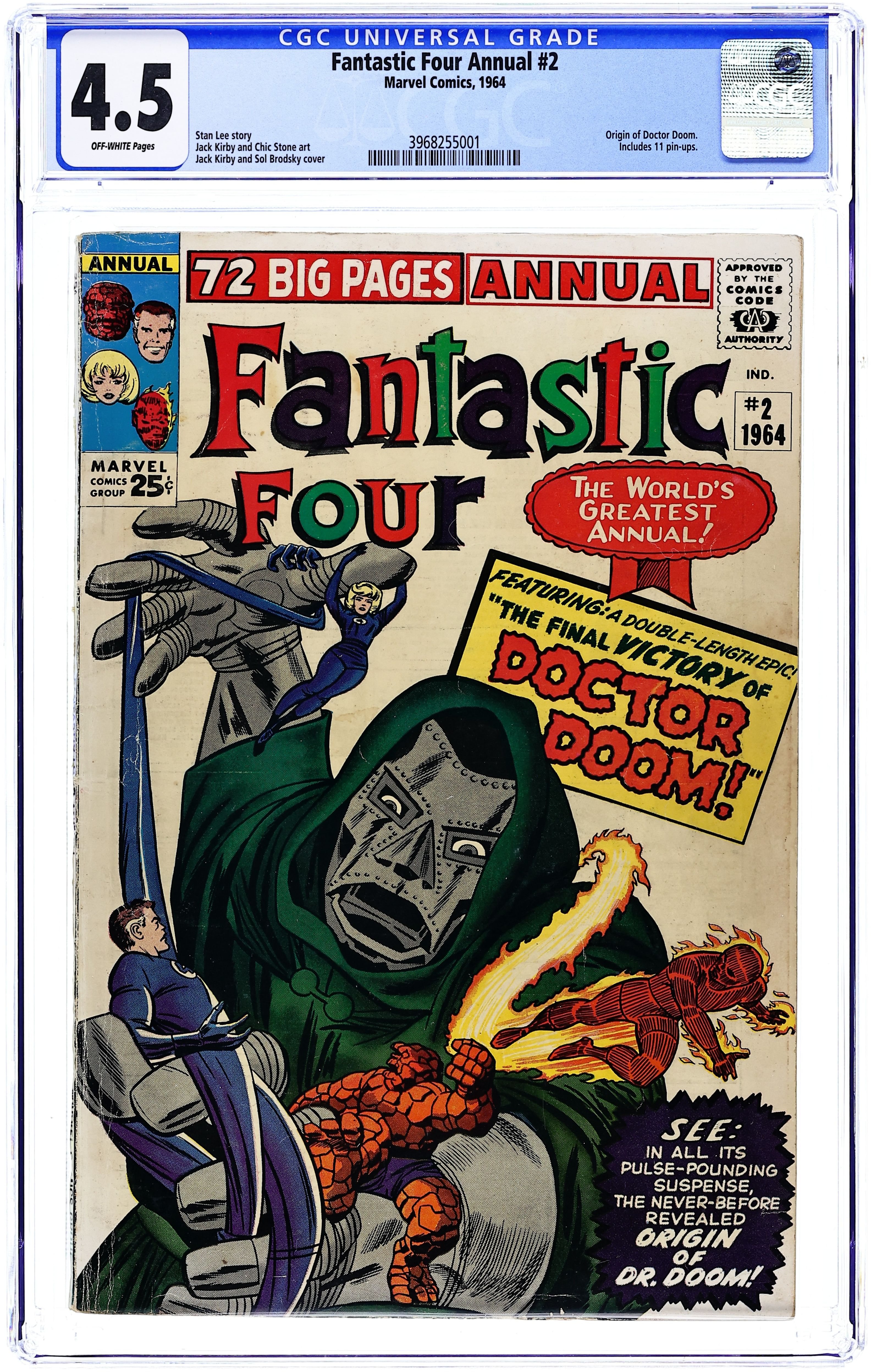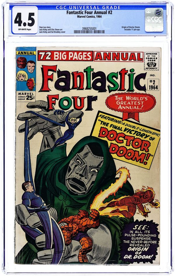 2 new Doctor Doom stories, "Origin of Doctor Doom!" and "The Final Victory of Dr. Doom!" Scripts by Stan Lee, pencils by Jack Kirby, inks by Chic Stone. Six pages of pin-ups by Kirby/Sol Brodsky. This issue also reprints "Prisoners of Doctor Doom" (from FF 5). Kirby/Stone cover. 76 pgs. Cover price $0.25. Grade: CGC 4.5 explanation of grade Condition: Used (collectible)