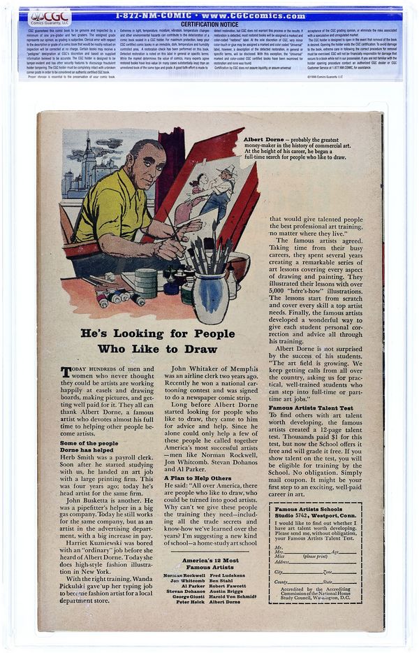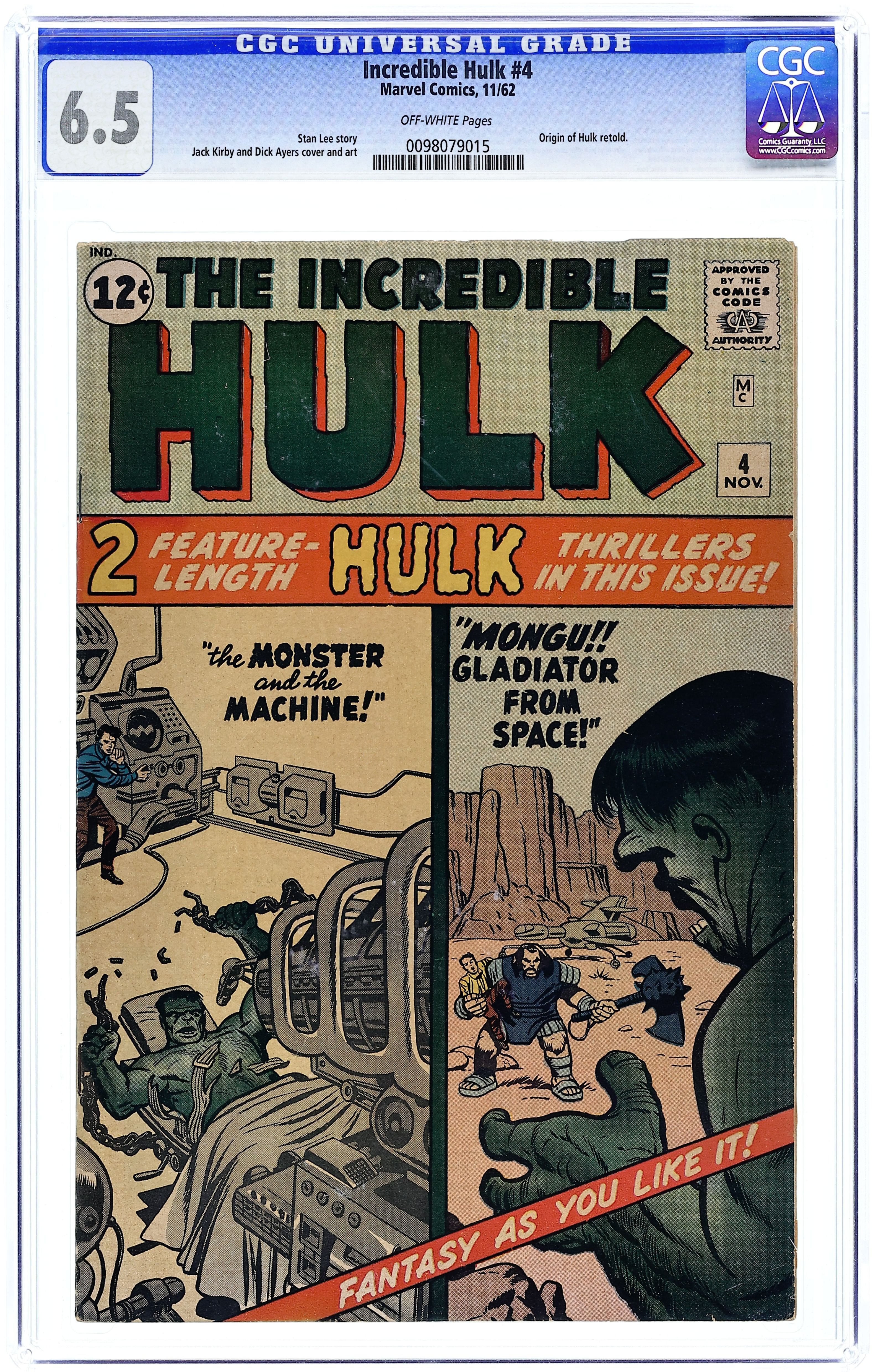 Cover pencils by Jack Kirby, inks by Dick Ayers. "The Monster and the Machine!," script by Stan Lee, pencils by Jack Kirby, inks by Dick Ayers; Rick uses some of Banner's machinery to transform the Hulk, who was stuck in his monster persona, back into Bruce. "The Gladiator from Outer Space!," script by Stan Lee, pencils by Jack Kirby, inks by Dick Ayers; An alien invades Earth and claims his people will conquer the planet unless he is met in battle by the strongest opponent the world has to offer; Hulk meets the challenge but finds out it is all a ploy by the Russians to capture him and create an army of hulks of their own. 36 pgs., full color. $0.12. Cover price $0.12. Grade: CGC 6.5 explanation of grade Condition: Used (collectible)