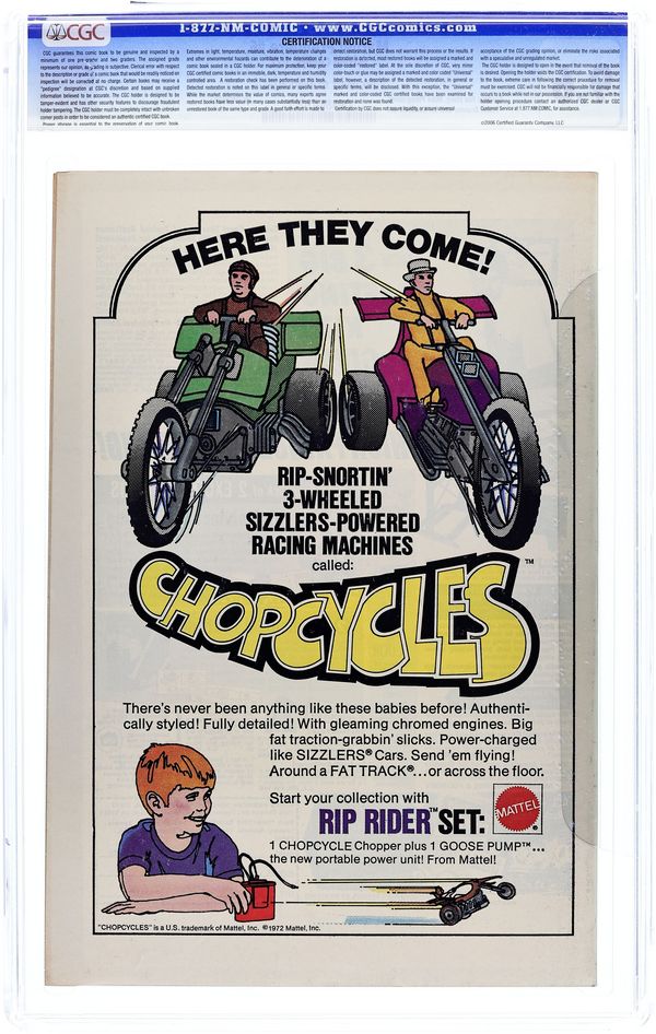 Cover art by Mike Ploog and Frank Giacoia (alterations). The Shambler from the Sea, script by Gardner F. Fox, pencils by Frank Brunner, inks by Sal Buscema; Strange kills Sligguth, which wakens Shambler from the Sea, N'Gabthoth; Clea and Wong are overcome by Starksboro cult; Strange frees them from sacrifice to N'Gabthoth, and discovers map of Stonehenge. Featuring concepts created by Robert E. Howard. Comics ad for the NBC Saturday morning kid shows: Kids [Adam; Evy]; the Barkleys; the Houndcats; the Jetsons; the Pink Panther; the Roman Holidays; and Underdog. 36 pgs. $0.20. Cover price $0.20. Grade: CGC 9.6 explanation of grade Condition: Used (collectible)