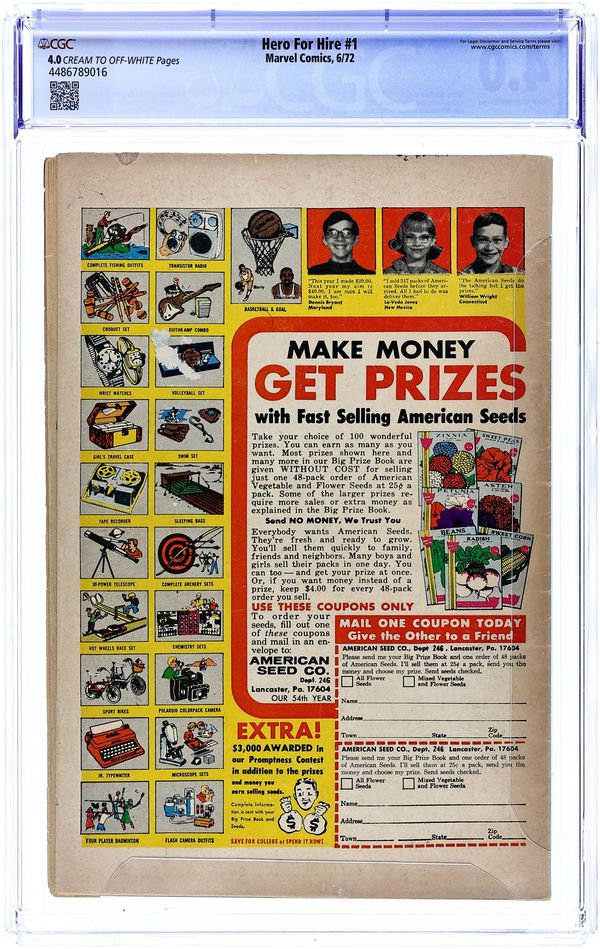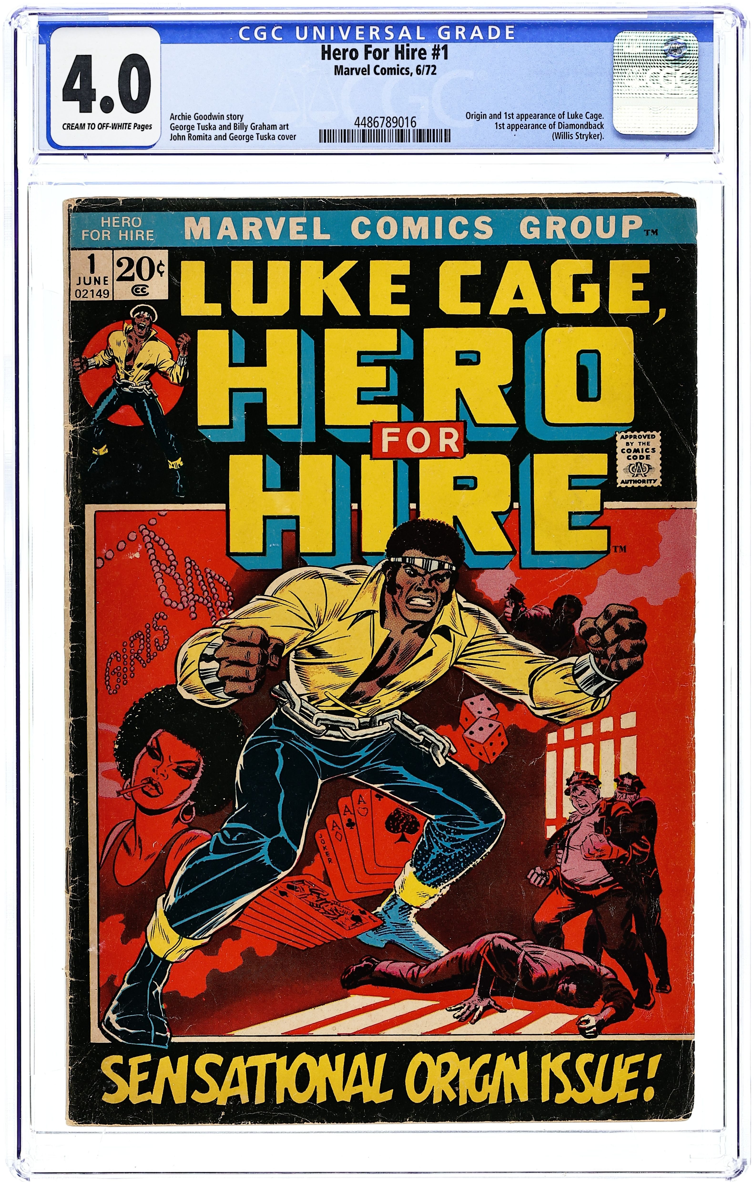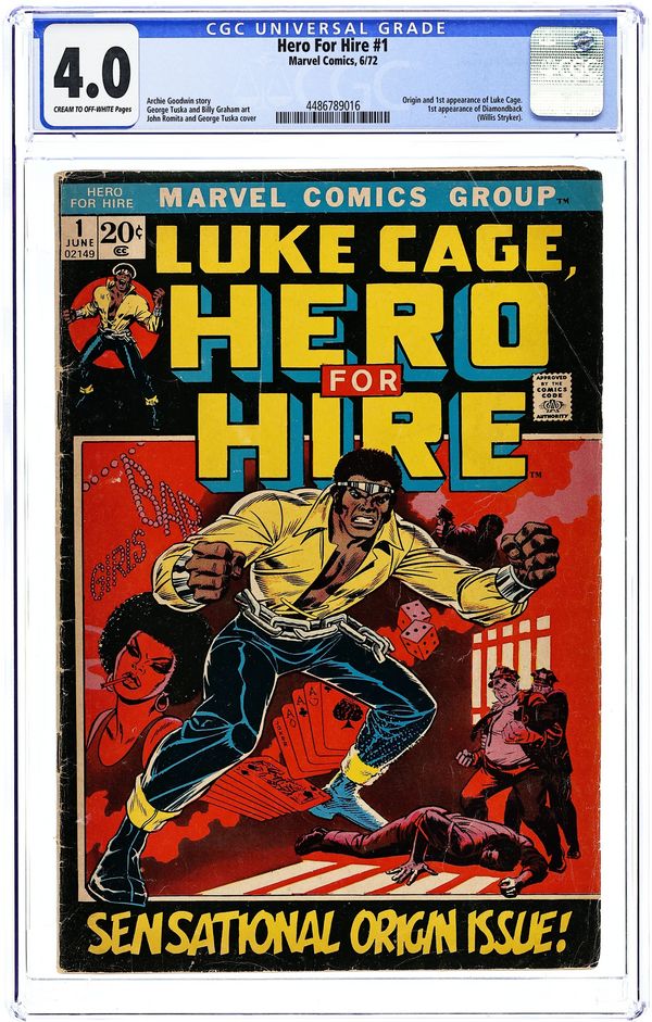 "Out of Hell--a Hero!" Script by Archie Goodwin, pencils by George Tuska, inks by Billy Graham. NOTE: Roy Thomas and John Romita are credited for their "considerable creative contributions." When Lucas, an innocent man, is sent to jail for a crime he did not commit, he decides he has nothing left to loose. Subjecting himself to unorthodox experiments, this inmate is endowed with great physical strength and nigh-unbreakable skin. No walls and bars on Earth can hold him. Now, as Luke Cage, he is known as the Hero for Hire, and he's here to clean up the "Mean Streets," one criminal at a time. Cover price $0.20. Grade: CGC 4.0 explanation of grade Condition: Used (collectible)