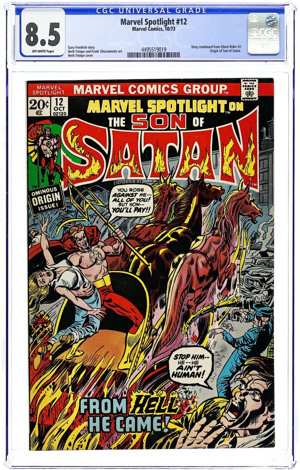 Starts May 18 Cover pencils by Herb Trimpe. The Son of Satan, script by Gary Friedrich, pencils by Herb Trimpe, inks by Frank Chiaramonte; Sam Silvercloud and Snake free Daimon Hellstrom from his self-imposed emprisonment; Son of Satan seeks out Witch Woman and Ghost Rider and is attacked by his fathers minions; Origin and second appearance of The Son of Satan! (First appearance of Daimon Hellstrom is Ghost Rider 2.) Story continued from Ghost Rider (1973 series) #2. 36 pages, full color. Cover price $0.20. Grade: CGC 8.5 explanation of grade Condition: Used (collectible)