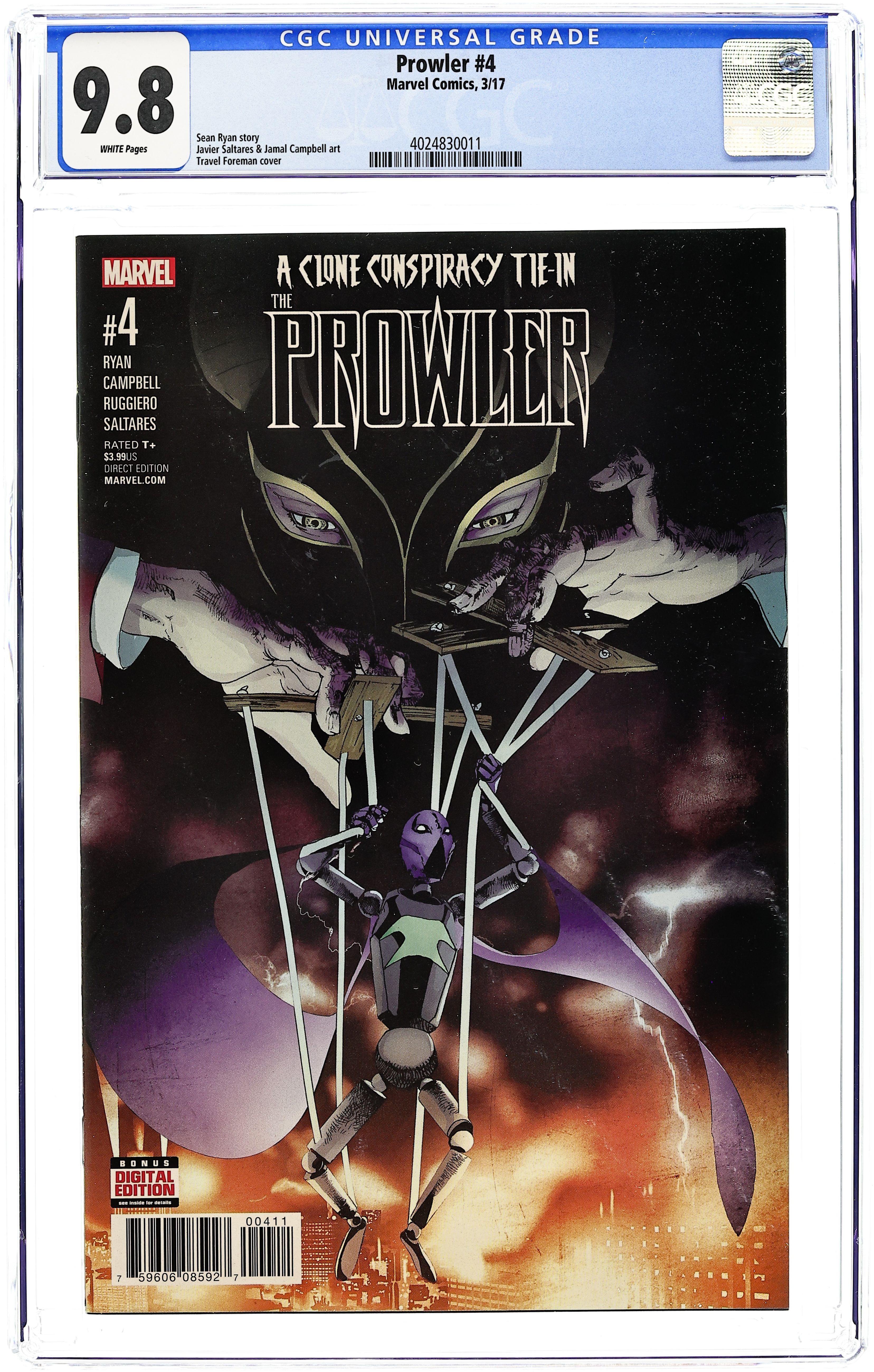 Starts May 18 A CLONE CONSPIRACY TIE-IN - Written by Sean Ryan. Art by Jamal Campbell and Javier Saltares. Cover by Travel Foreman. Prowler's felt right at home working for NEW U. After all, they're a force for good. But after a painful confrontation with the new Electro and a bare-knuckle brawl with Julia Carpenter, a.k.a. MADAME WEB, Prowler's second-guessing himself and New U's mission… …and THE JACKAL doesn't tolerate dissent, especially when it could jeopardize everything he's worked to build! Rated T+ Cover price $3.99. Grade: CGC 9.8 explanation of grade Condition: Used (collectible)