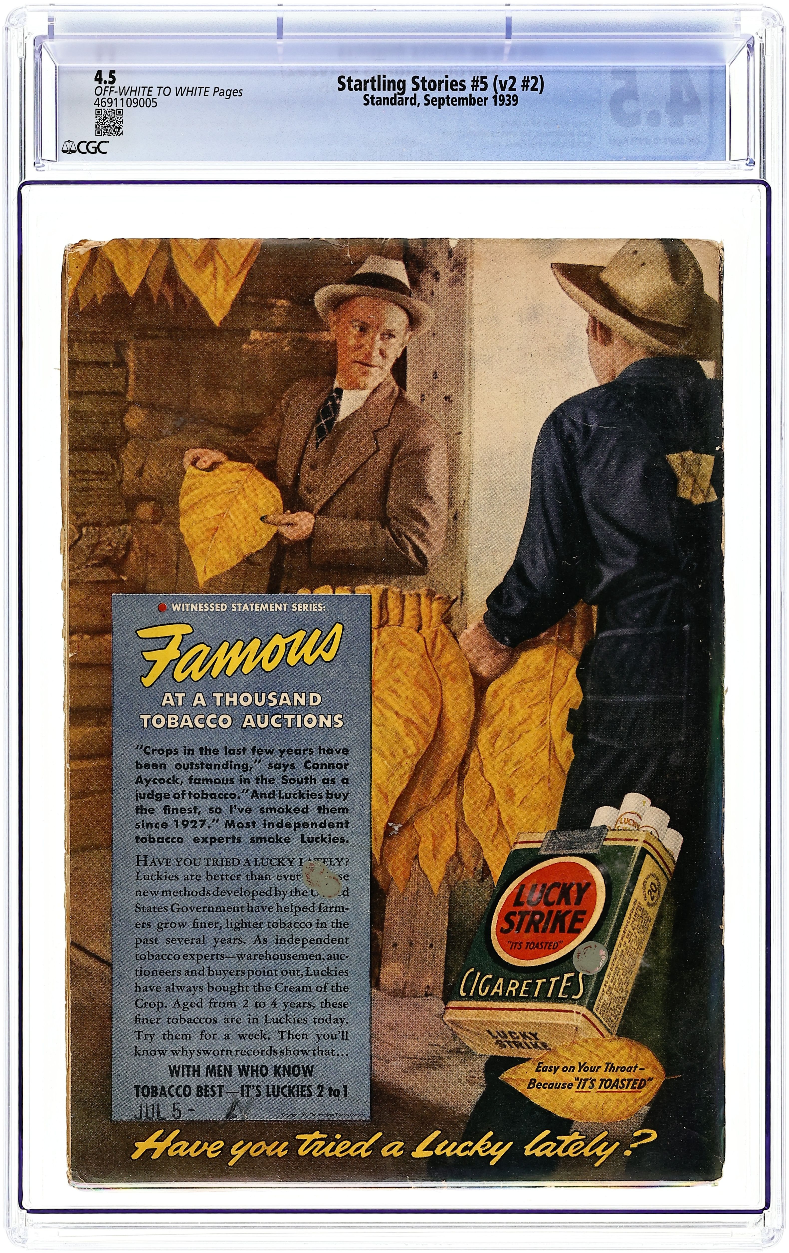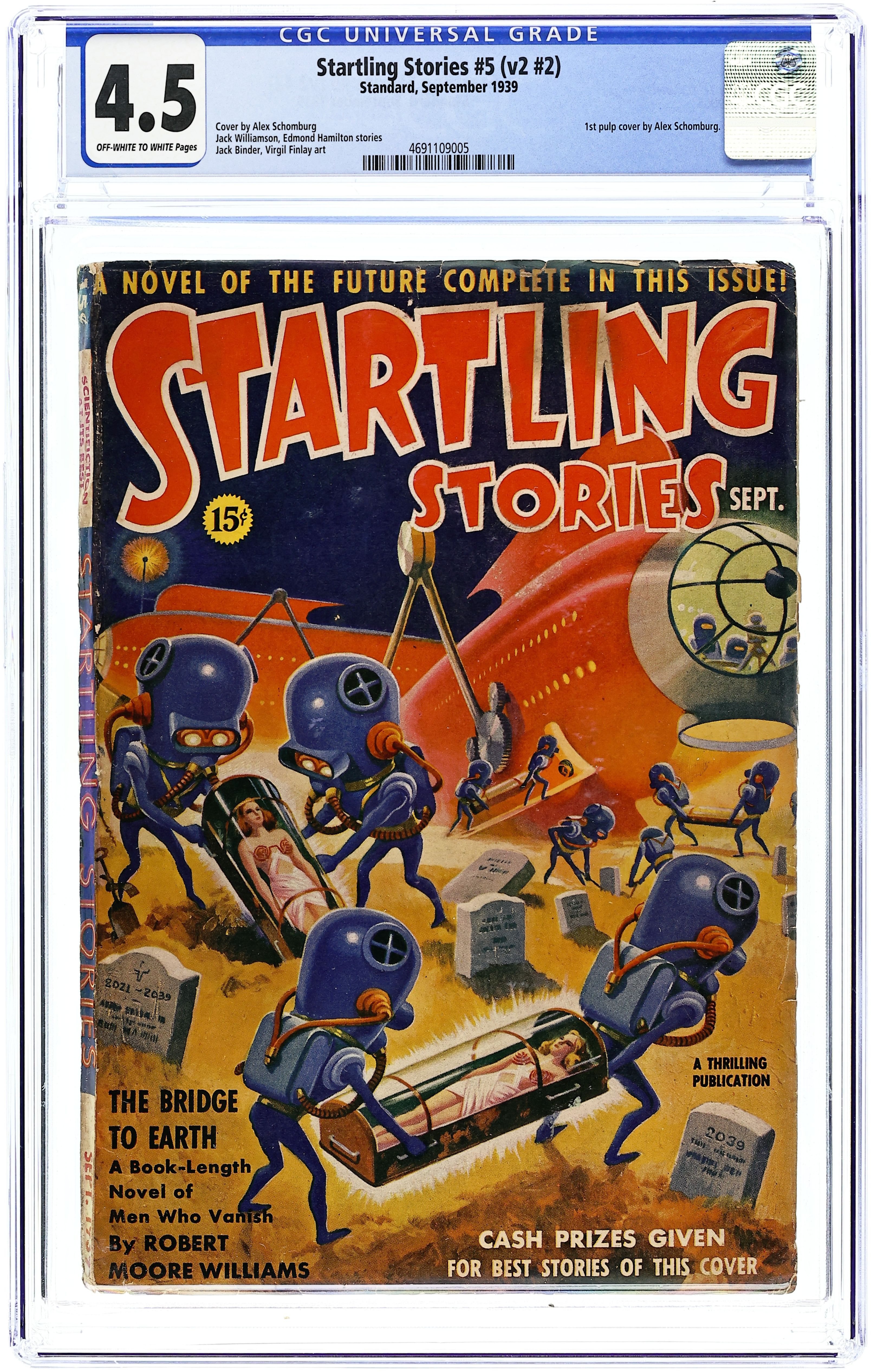 Sept 1939. Cover by Alex Schomburg (1st pulp cover by Alex). Stories by Robert Moore Williams, Robert Arthur, John Russell Fearn, and Edmond Hamilton. "Thrills in Science" by Mort Weisinger. Two-page Alfred Bernhard Nobel bio in comic form. Virgil Finlay illustration. 6.75-in. x 9.75-in.; black and white; 128 pages. Cover price $0.15. Grade: CGC 4.5 explanation of grade Condition: Used (collectible)