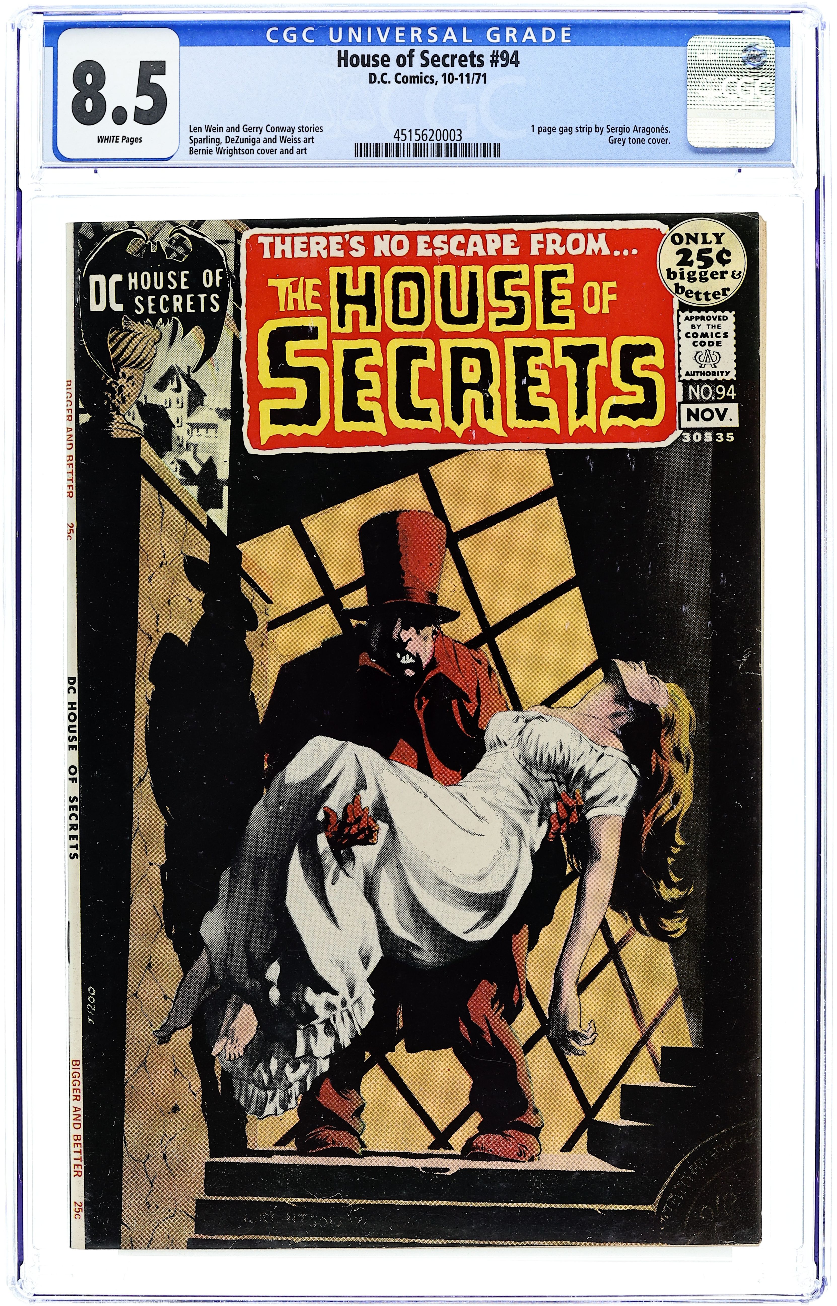 Cover art by Bernie Wrightson. "The Man with My Face," art by Jack Sparling; A gambler agrees to switch bodies with a mysterious stranger in exchange for a lucky silver dollar which allows him to never lose a bet. "Hyde--and Go Seek!", script by Len Wein, art by Tony DeZuniga; A henpecked police officer is shocked to find out his best friend was searching for a cure for drug addiction and developed a serum that transformed him into a strangler that choose his victims among girls who reminded him of his wife who left him. "The Day Nobody Died," art by George Roussos; A man is certain no one will die today because he is Death and it's his day off. "Track of the Invisible Beast," art by Alex Toth. Abel's Fables cartoon page by Sergio Aragones. "A Bottle of Incense.. A Whiff of the Past!", script by Gerry Conway, pencils by Alan Weiss, inks by Bernie Wrightson and Alan Weiss; An old woman who lost a man she fancied in an auto accident fifty years ago uses an occult ritual to return him to her, but he returns as a hungry zombie who devours her. 52 Pages, Full Color. Cover price $0.25. Grade: CGC 8.5 explanation of grade Condition: Used (collectible)