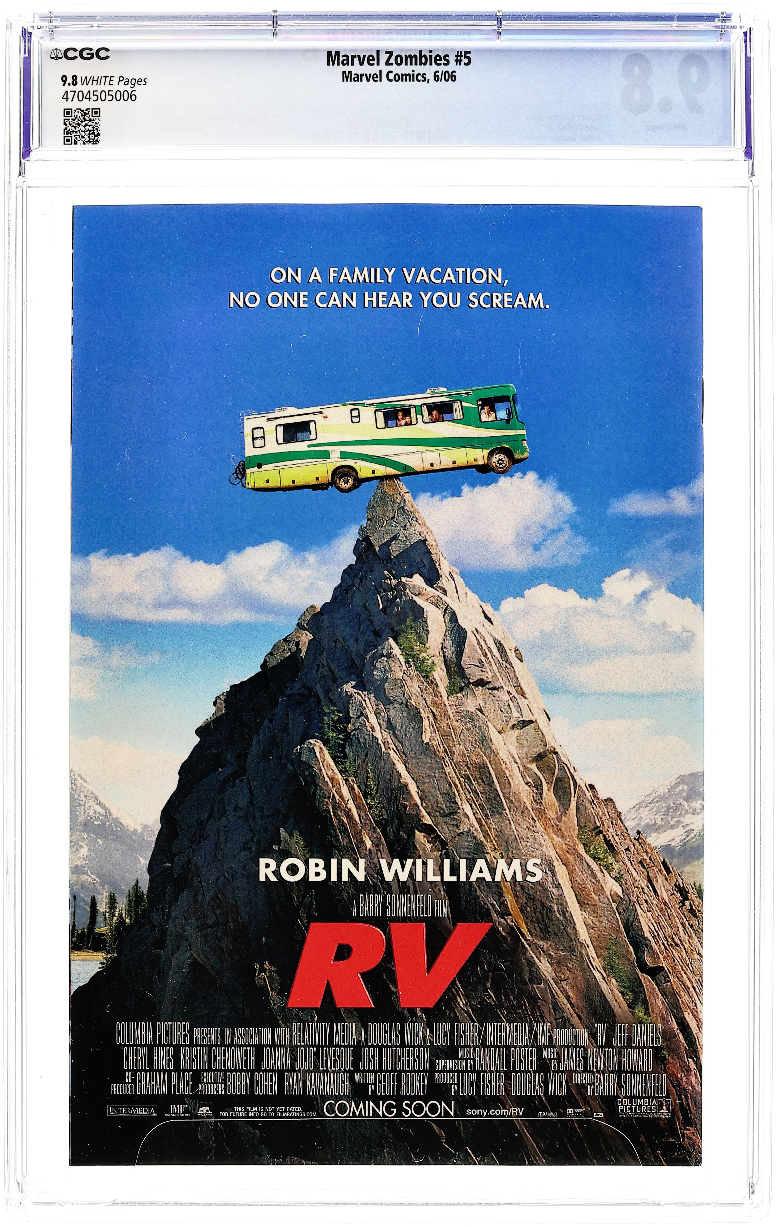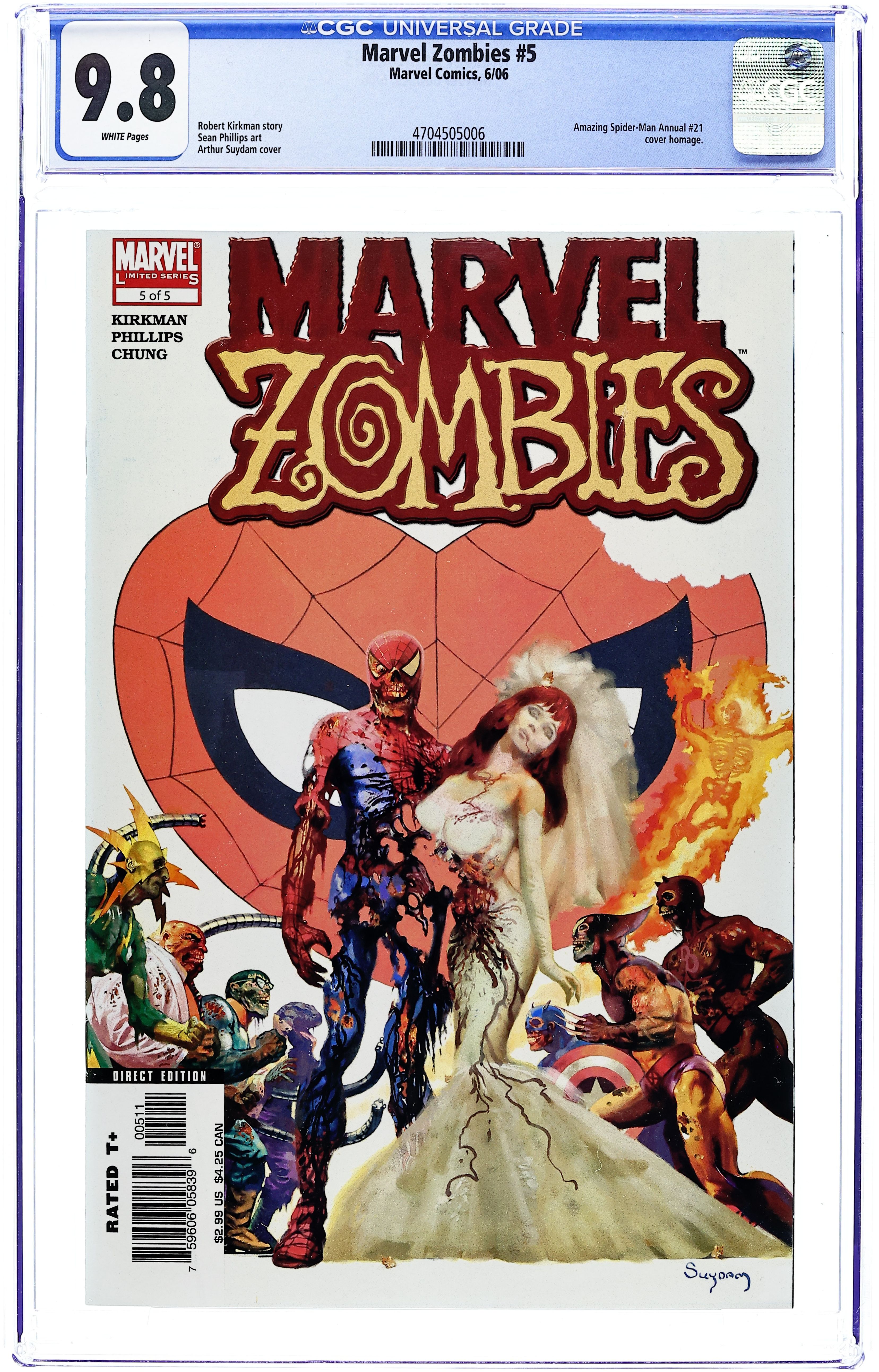 First Printing. Written by ROBERT KIRKMAN Penciled by SEAN PHILLIPS. Cover by ARTHUR SUYDAM. Is it wedding bells-or an Undead extravaganza!?! The world-devouring Galactus makes his way to Earth to discover the dominant life form is-Marvel Zombies! Can the zombies defend their world from the Big G or will they meet their end in a planet-wide conflagration? The answer will shock you in this conclusion that ties into Ultimate Fantastic Four: 'Frightful,' beginning next month! Cover price $2.99. Grade: CGC 9.8 explanation of grade Condition: Used (collectible)