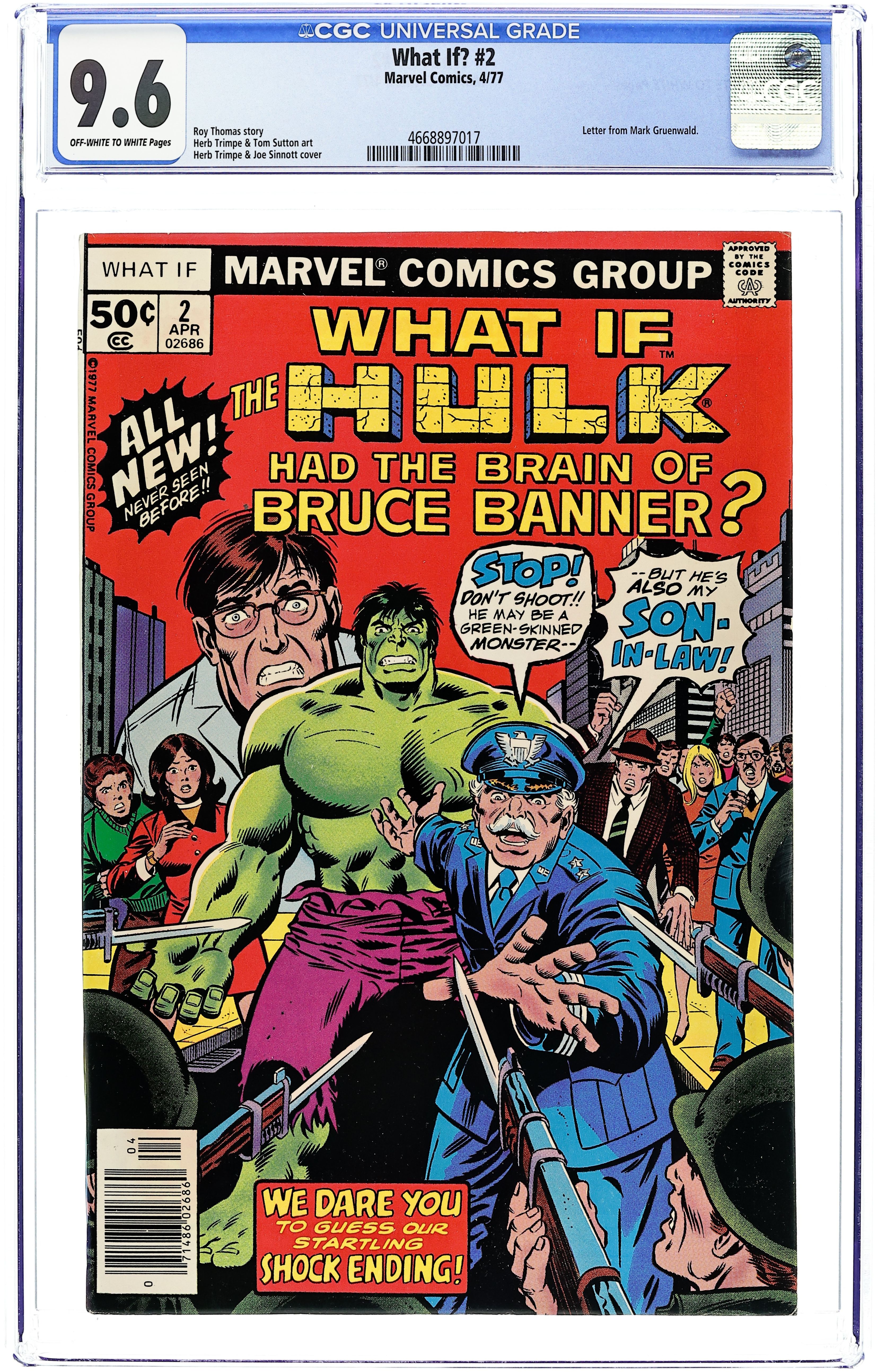 Cover pencils by Herb Trimpe, inks by Joe Sinnott. What if the Hulk had Always had Bruce Banner's Brain?, script by Roy Thomas, pencils by Herb Trimpe, inks by Tom Sutton; ulk retains his intelligence and teams up with Mr. Fantastic and Professor X against Galactus; cameos by the Avengers, Galactus, and the Avengers. Letter to the editor from comics writer Mark Gruenwald. 52 pgs. Cover price $0.50. Grade: CGC 9.6 explanation of grade Condition: Used (collectible)