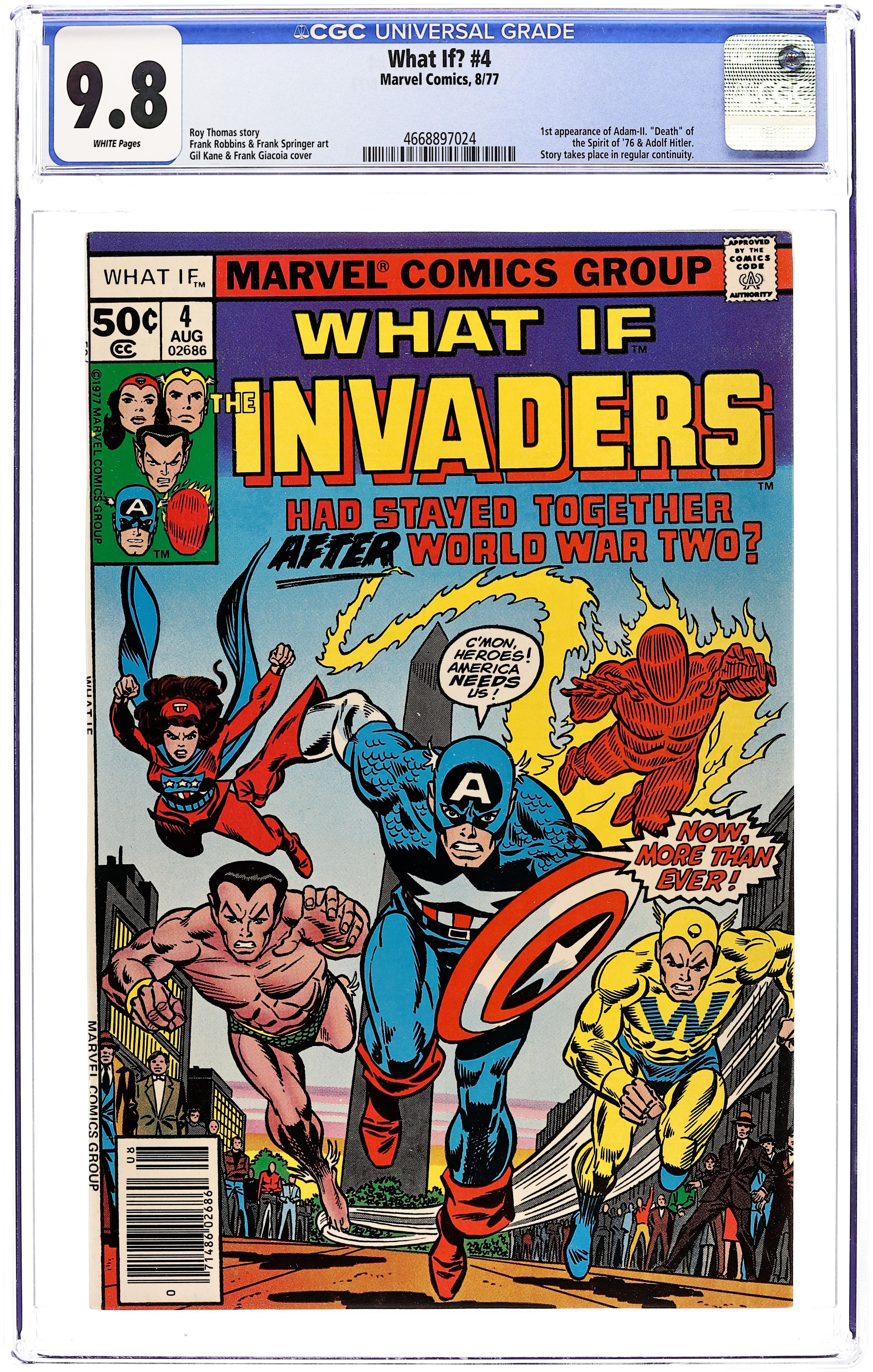 Cover pencils by Gil Kane, inks by Frank Giacoia. What if the Invaders Had Stayed Together After World War Two? starring the Invaders, script by Roy Thomas, pencils by Frank Robbins (breakdowns) and Frank Springer (finished art), inks by Frank Springer; This story is in continuity and explains the post-1945 Captain America; It features the death of the Spirit of '76 (Cap II) and the introduction of the Patriot as Capt III. Hostess Twinkie ad with Spider-Man, pencils by Ross Andru, inks by Mike Esposito. Article by Roy Thomas called Why Not? 52 pgs. Cover price $0.50. Grade: CGC 9.8 explanation of grade Condition: Used (collectible)