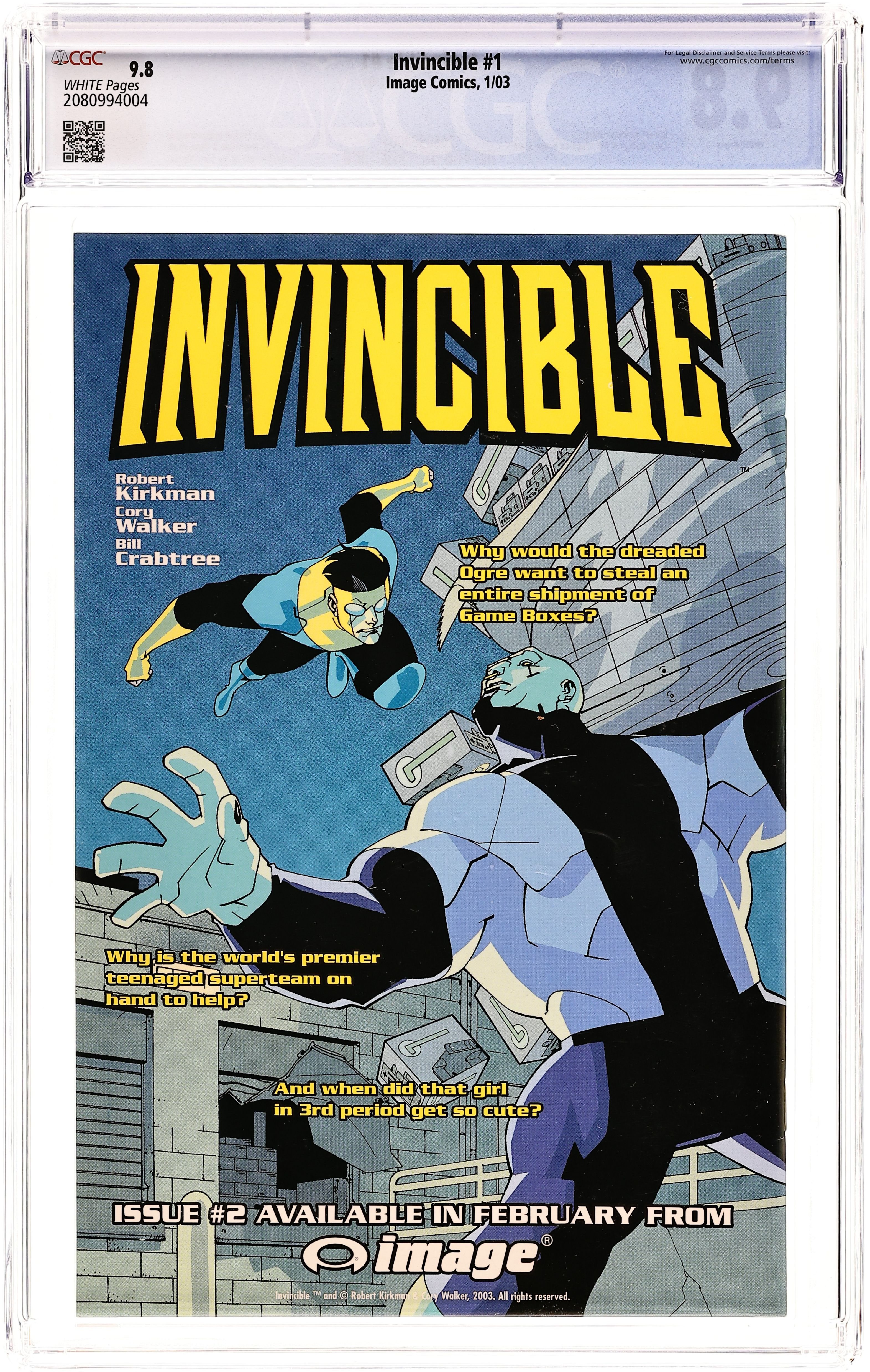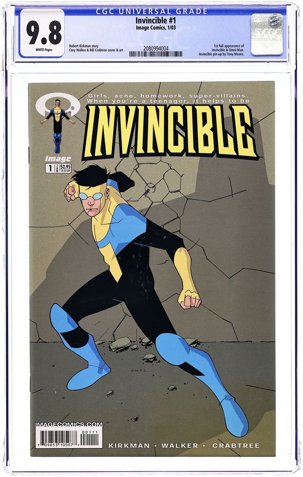 (W) Robert Kirkman (A) Cory Walker (C) Cory Walker & Bill Crabtree. The Concept: Mark Grayson is just like most everyone else his age. He's a senior at a normal American high School. He has a crappy part time job after school and on weekends. He likes girls quite a bit... but doesn't quite understand them. He enjoys hanging out with his friends, and sleeping late on Saturdays... at least until the good cartoons come on. The only difference between Mark and everyone else is that his father is the most powerful superhero on the planet, and as of late, he seems to be inheriting his father's powers. Which sounds okay at first, but how do you follow in your father's footsteps when you know you will never live up to his standards? This Issue: ORIGIN ISSUE!!! Strange things begin to happen to Mark Grayson as he begins to develop superpowers. Luckily, his dad is around to show him the ropes, at least he WOULD be if he weren't so busy saving the world all the time. Mark is forced to go out on his own, and try and figure out how all this superheroing business works. The results are a monumental disaster. Meanwhile, there's trouble at school, when Mark is drug into a fight of epic proportions. I dare you to miss it... well... not really... I'd prefer if you just bought it. FC32pp$2.95Ongoing monthly series Cover price $2.95. Grade: CGC 9.8 explanation of grade Condition: Used (collectible)