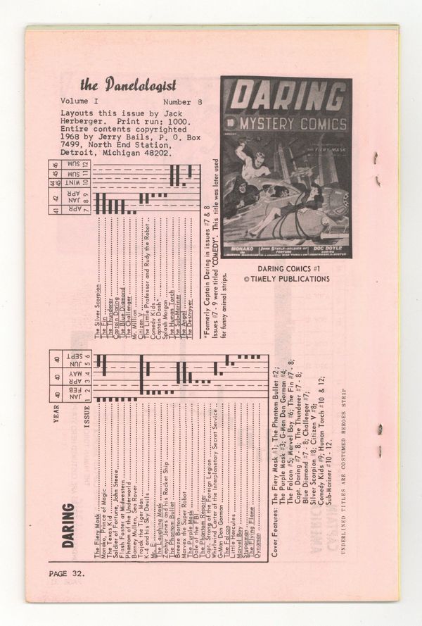 Starts Jul 4 Volume 1, issue 1-8 in a stapled collection. Fanzine created by Jerry Bails. Includes a chronology of the Second Heroic Age of Comics between 1956-1967. Also features an index to fanzine articles. Stapled pages, 5-1/2" x 8-1/2", 32 pages, B&W. Grade: FN 6.0 explanation of grade Condition: Used (collectible)