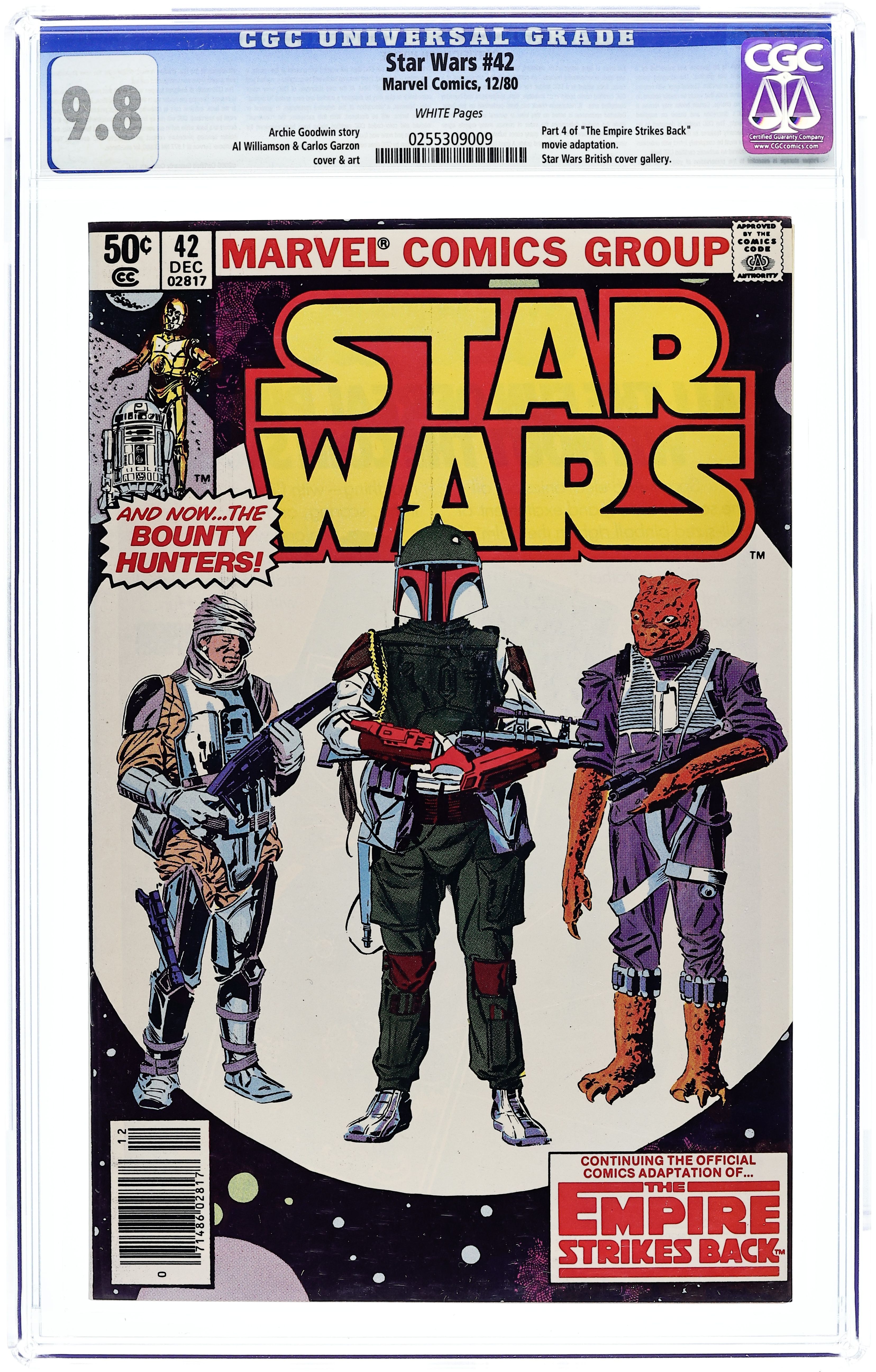 Newsstand Edition. 1st Comic appearance of Boba Fett. The Empire Strikes Back: Part 4 of 6. And now...the bounty hunters! "To Be a Jedi!" Script by Archie Goodwin, art by Al Williamson and Carlos Garzon. Note: Part 4 of movie adaptation; based on the movie script; Williamson and Garzon both pencil and ink the art for this series. Plus: 5-page "Star Wars British Cover Gallery," featuring art by Carmine Infantino, Gene Day and Dan Green. Cover by Williamson and Garzon. Cover price $0.50. Grade: CGC 9.8 explanation of grade Condition: Used (collectible)