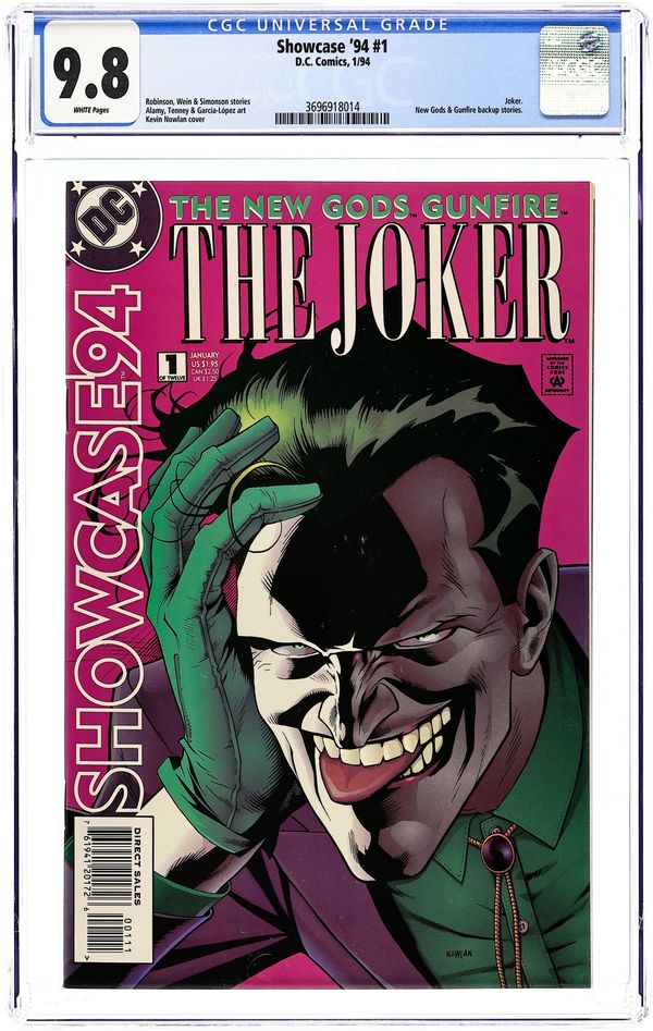 Starts May 25 "The Great Pretender" Starring The Joker by James Robinson (script) & Christian Alamy (art); Kevin Nowlan cover; "State of Siege" part 1 Starring Gunfire by Len Wein (script) & Tom Tenney (art); New Gods by Walt (Walter) Simonson (script) & Jose Garcia-Lopez (art); Dominion, Metron, Orion, Ligea app; Cameo by Batman; Cover price $1.95. Grade: CGC 9.8 explanation of grade Condition: Used (collectible)