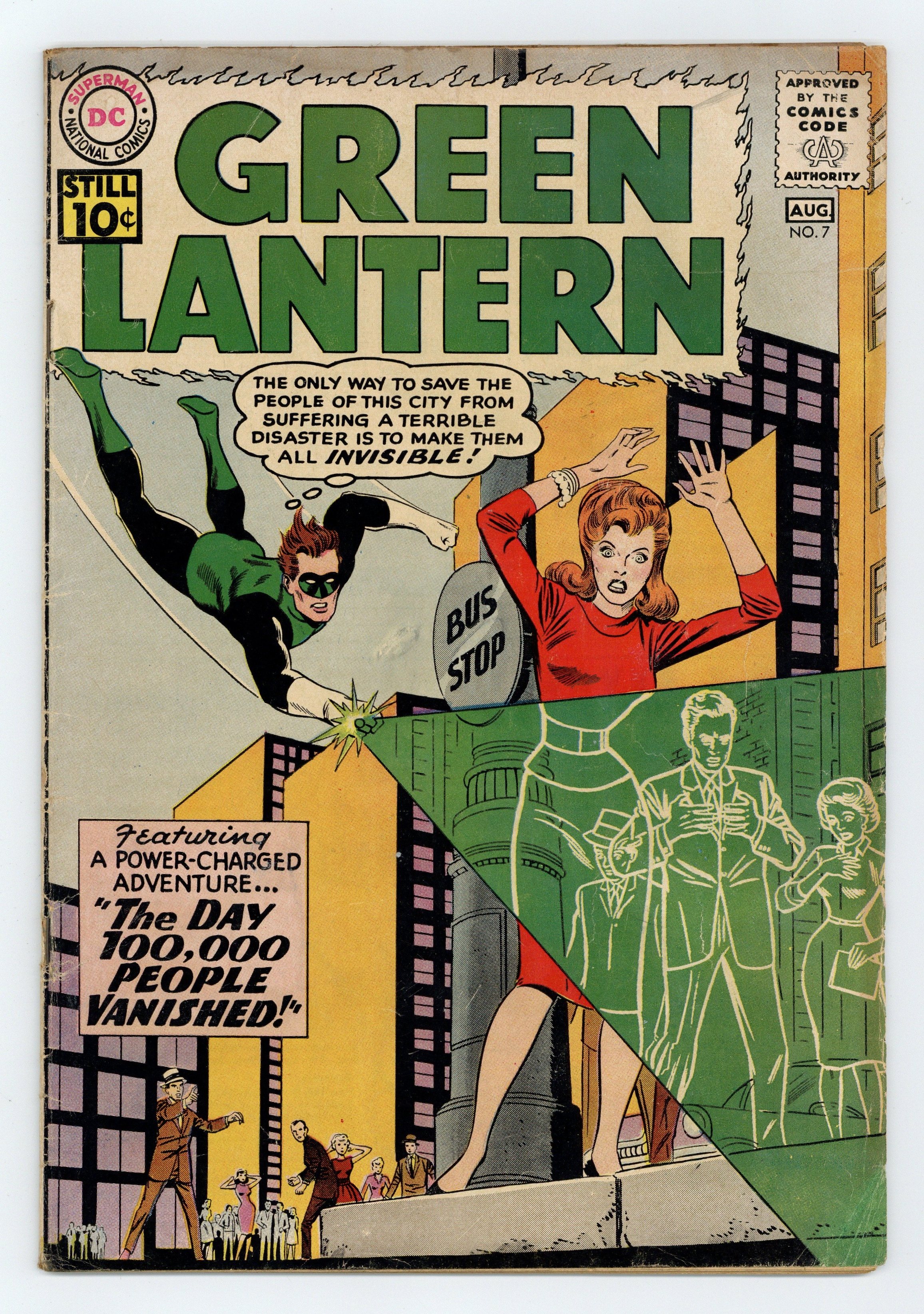 Origin and first appearance of Sinestro. Cover pencils by Gil Kane, inks by Joe Giella. The Day 100,000 People Vanished!, script by John Broome, pencils by Gil Kane, inks by Joe Giella; In an attempt to capture Green Lantern, Sinestro captures 100,000 people from the town of Valdale; The Guardians warn Green Lantern of Sinestro's plan and Green Lantern travels to Qward to rescue the citizens of Valdale. Wings of Destiny!, script by John Broome, pencils by Gil Kane, inks by Joe Giella; Green Lantern accidentally changes Pieface into a bird while Green Lantern is having a dream. Later Green Lantern has to meet Terga at the airport and stop a hijacking. 36 pgs. $0.10. Cover price $0.10. Grade: GD 2.0 explanation of grade Condition: Used (collectible)