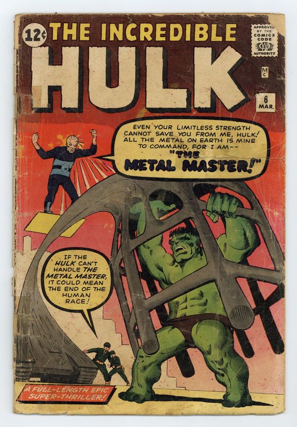 Cover by Steve Ditko. Introduction of the Teen Brigade in "The Incredible Hulk vs The Metal Master!," script by Stan Lee, art by Steve Ditko; Finding his transformations more and more difficult using his gamma ray machine, the Hulk with Banner's brain also finds that he has Banner's features when he zaps himself to face the alien invading Metal Master and his head does not transform; The power of the Metal Master is too much for the Hulk and he is captured by Ross. Rick forms the Teen Brigade; Hulk breaks free of Ross's bunker and then pulls off one of the boldest victories against one of the most powerful aliens ever seen. 36 pgs., full color. The Hulk's solo adventures continue in the pages of Tales to Astonish (1959-1968 1st Series) #59. Cover price $0.12. Grade: FR 1.0 explanation of grade Condition: Used (collectible)