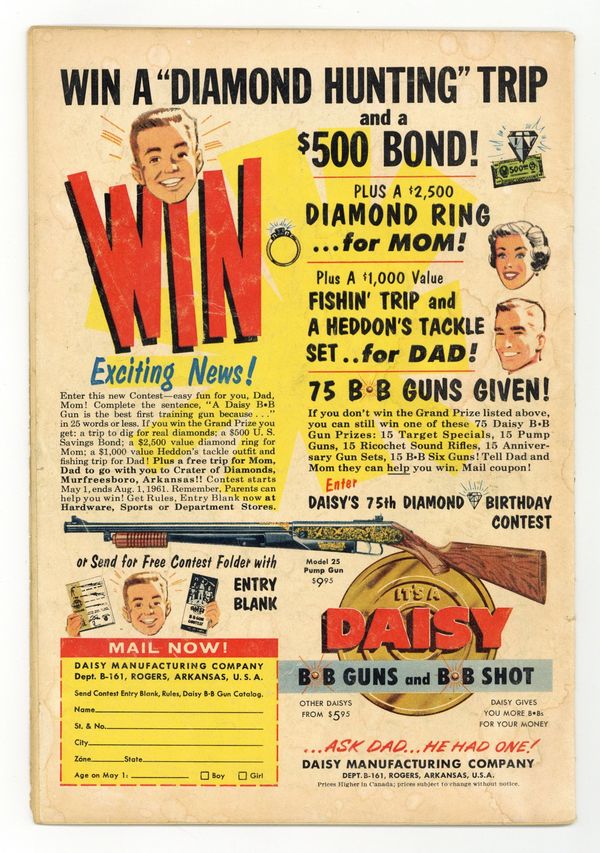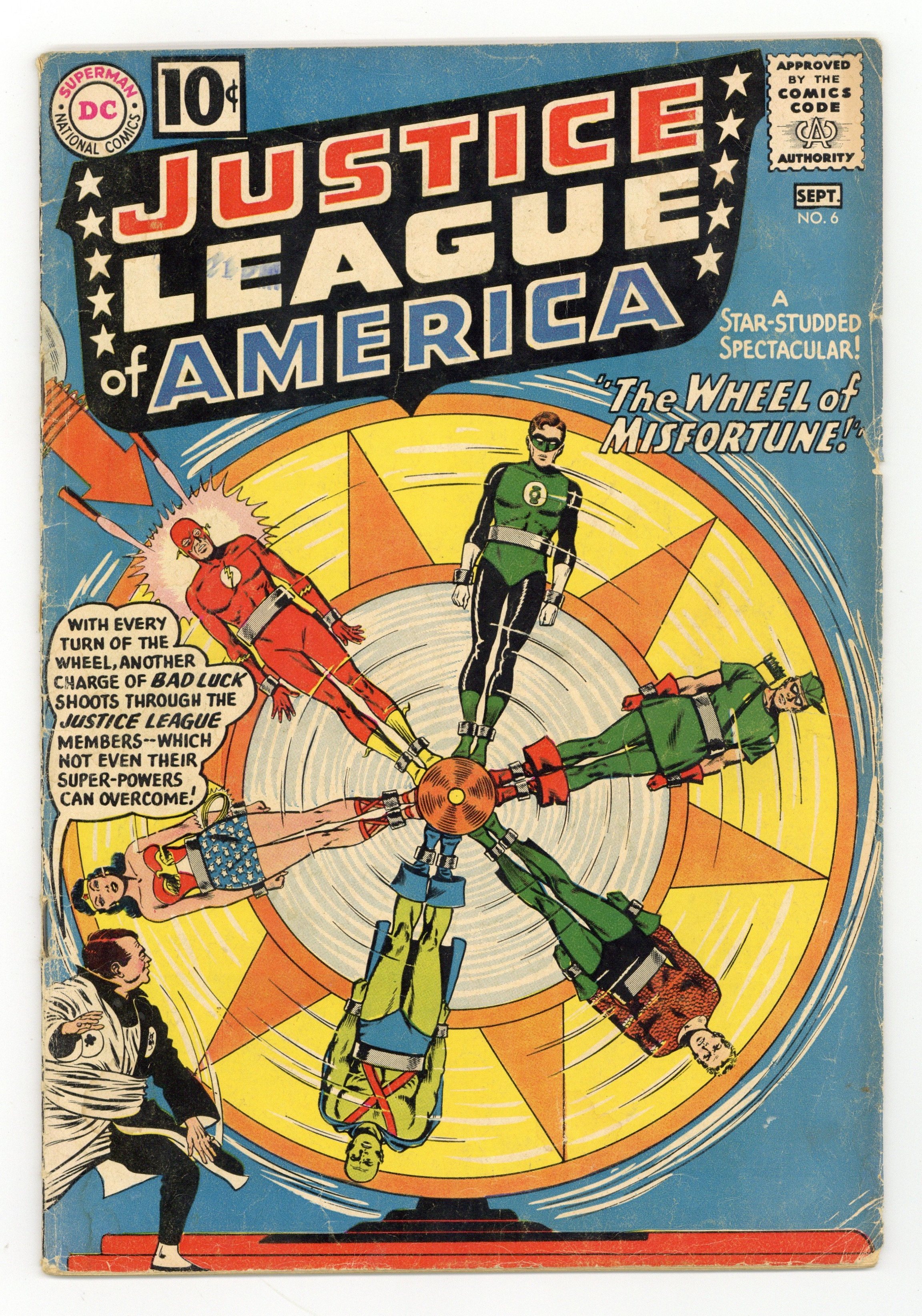 Starts May 18 Cover pencils by Mike Sekowsky, inks by Murphy Anderson. The Wheel of Misfortune!, script by Gardner Fox, pencils by Mike Sekowsky, inks by Bernard Sachs; Professor Amos Fortune has found a way to control luck itself with his Stimoluck device, and the Justice League must find a way to overcome his unnaturally good luck while dealing with their own unnaturally bad luck. 36 pgs. $0.10. Cover price $0.10. Grade: GD 2.0 explanation of grade Condition: Used (collectible)