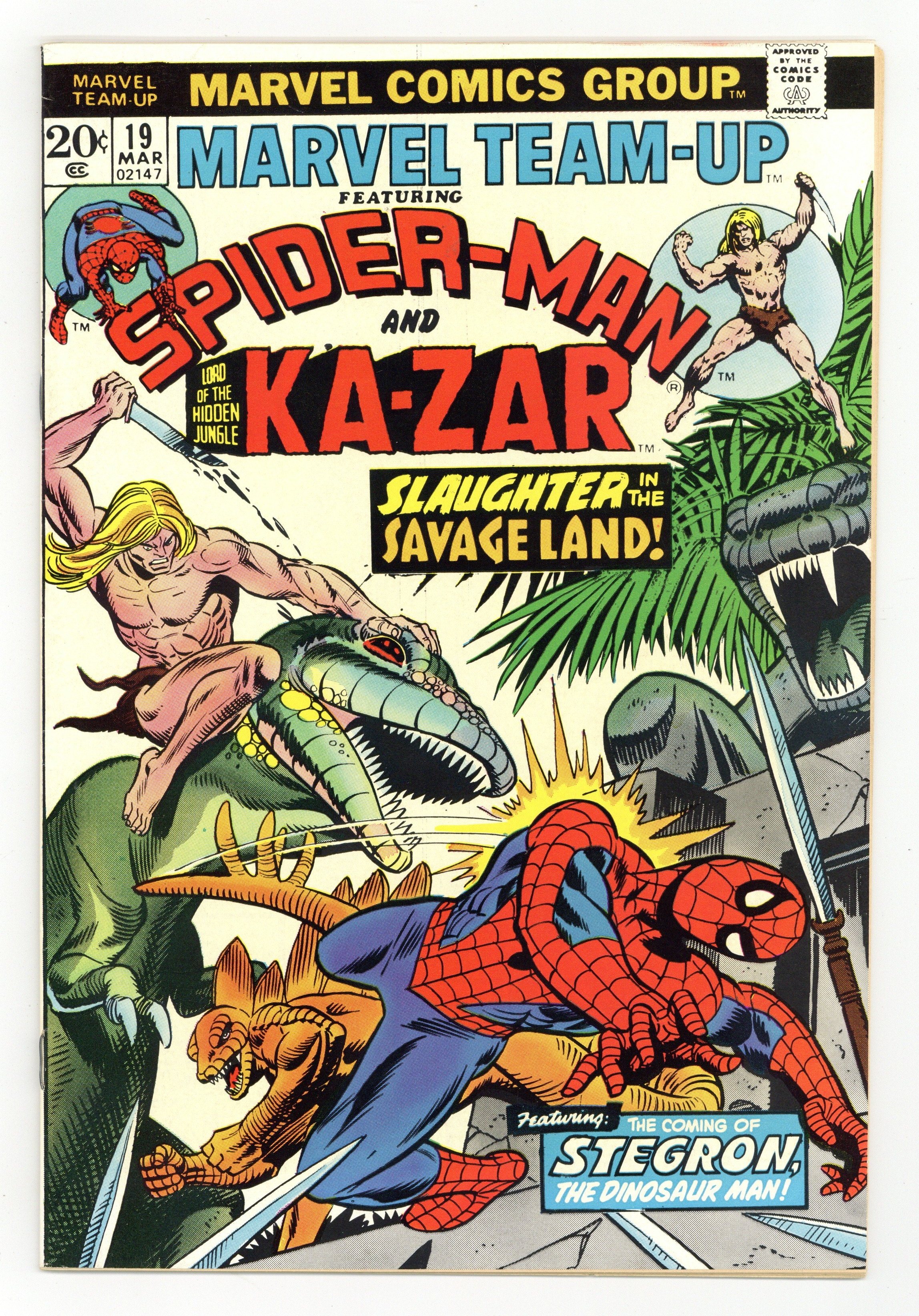 Starts May 25 Spider-Man and Ka-Zar in "The Coming of Stegron the Dinosaur Man!" Part 1 of 2. Script by Len Wein. Pencils by Gil Kane. Inks by Mike Esposito and Frank Giacoia. Cover by Gil Kane and Frank Giacoia. Spider-Man and Ka-Zar battle Stegron in the Savage Land. First appearance of Stegron. (The wall-crawler previously visited the Savage Land in Amazing Spider-Man 104. This issue was reprinted in Marvel Treasury Edition 22. The letters page contains Marvel Value Stamp Series A #90 Hercules.) Note: First appearance of Stegron. 36 pgs. Cover price $0.20. Grade: FN/VF 7.0 explanation of grade Condition: Used (collectible)