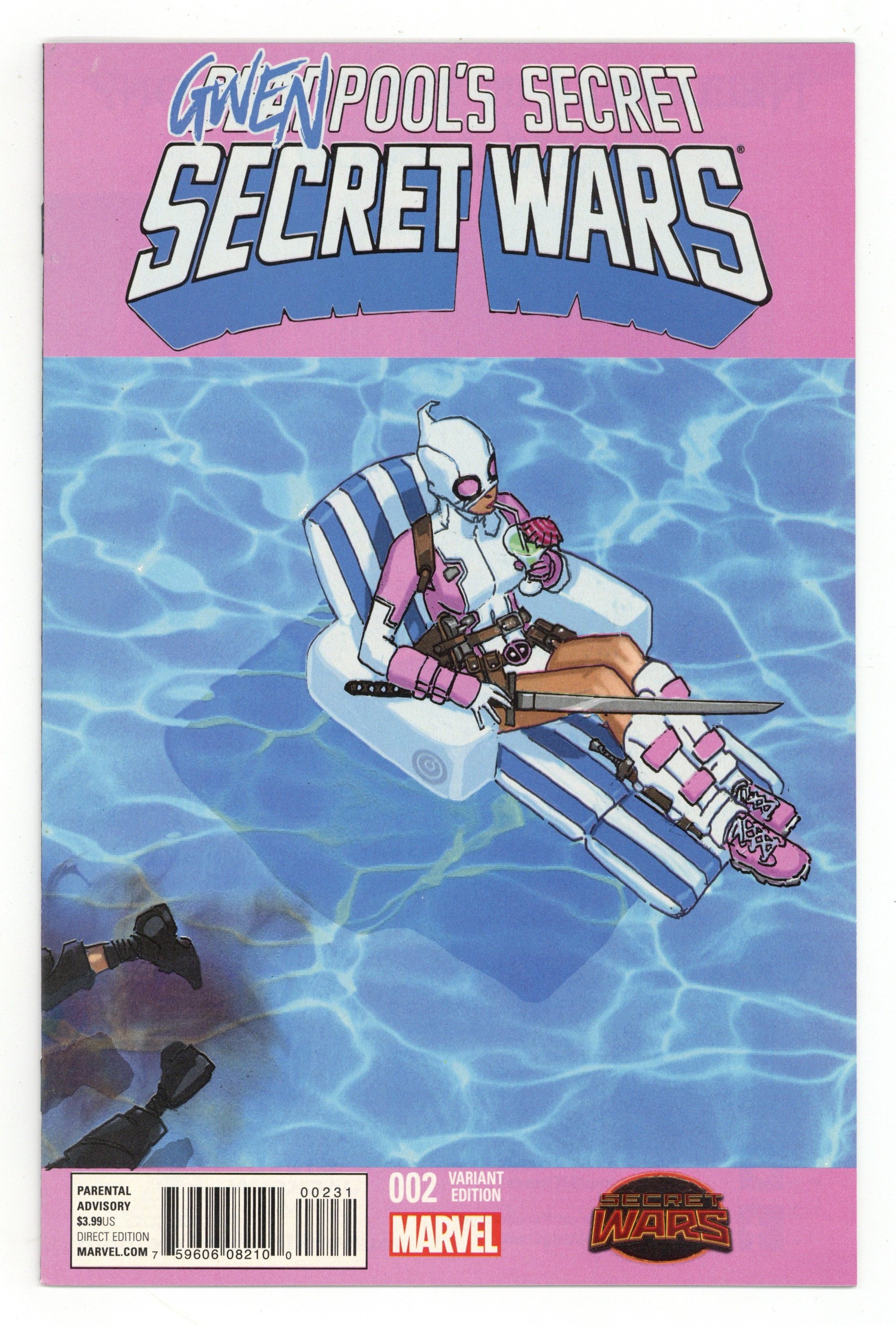Cover is first appearance of Gwenpool. Gwen Stacy Variant Cover. Written by Cullen Bunn. Art by Matteo Lolli. Cover by Chris Bachalo. If a secret war happens on a secret planet in secret space, and no one hears about it...DID IT REALLY HAPPEN?!?! That's what you'll be asking about this series for years to come! And the answer is YES! Deadpool really DID mess with the original Secret Wars! 28 pages, full color. Parental Advisory Cover price $3.99. Grade: NM- 9.2 explanation of grade Condition: Used (collectible)