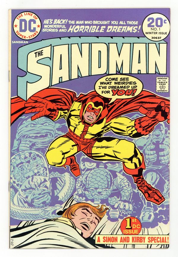 Purple cover variant. 1st Bronze Age Sandman. Last Simon & Kirby collaboration. Cover by Jack Kirby and Frank Giacoia. General Electric, script by Joe Simon, art by Jack Kirby and Mike Royer; When a boy named Jed Walker has a strange dream of a drowning man who appears in reality to give him an evil little doll, it spurs the Sandman to emerge from the Dream Stream into the real world to stop the plans of General Electric. Article on memory and dreams by Alan Asherman. 36 pgs., full color. $0.20. Cover price $0.20. Grade: FN/VF 7.0 explanation of grade Condition: Used (collectible)