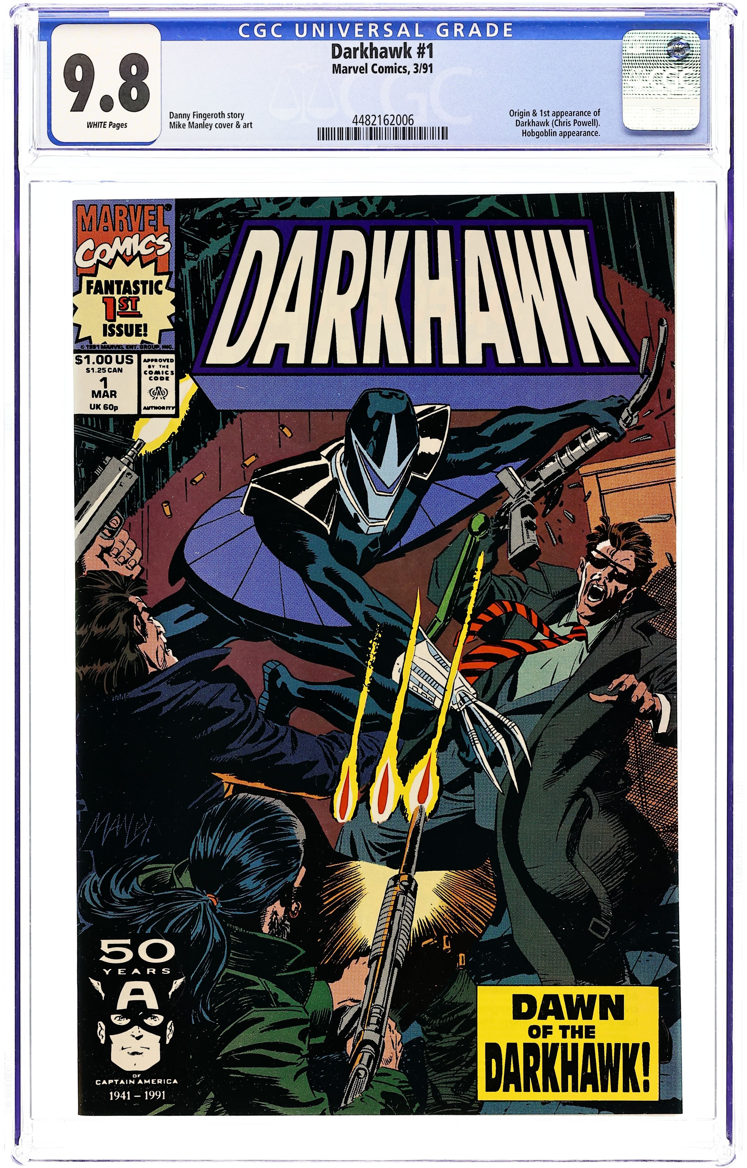 Starts May 25 Direct Edition. Cover art by Mike Manley. Dawn of the Darkhawk, script by Danny Fingeroth, art by Mike Manley; Chris Powell finds the Darkhawk amulet; Bazin is unable to bribe Chris' mother (an assistant DA), but bribes Chris' father (a cop) who then leaves the family; Bazin and Hobgoblin want the Darkhawk power; Saint Johnny gives Chris the name Darkhawk. 36 pgs. $1.00. Cover price $1.00. Grade: CGC 9.8 explanation of grade Condition: Used (collectible)
