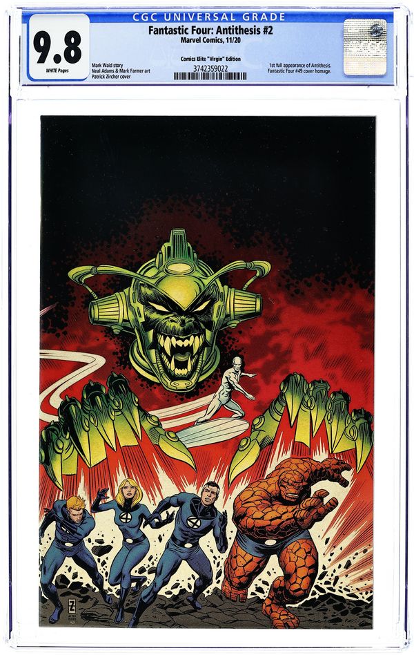 Comics Elite virgin variant cover by Patrick Zircher. Written by Mark Waid. Art by Neal Adams and Mark Farmer. The Silver Surfer leads the Fantastic Four in a mad race to find the missing Galactus. Only he has the power to defeat Antithesis - the Negative Zone version of Galactus himself! 32 pages, full color. Rated T Grade: CGC 9.8 explanation of grade Condition: Used (collectible)