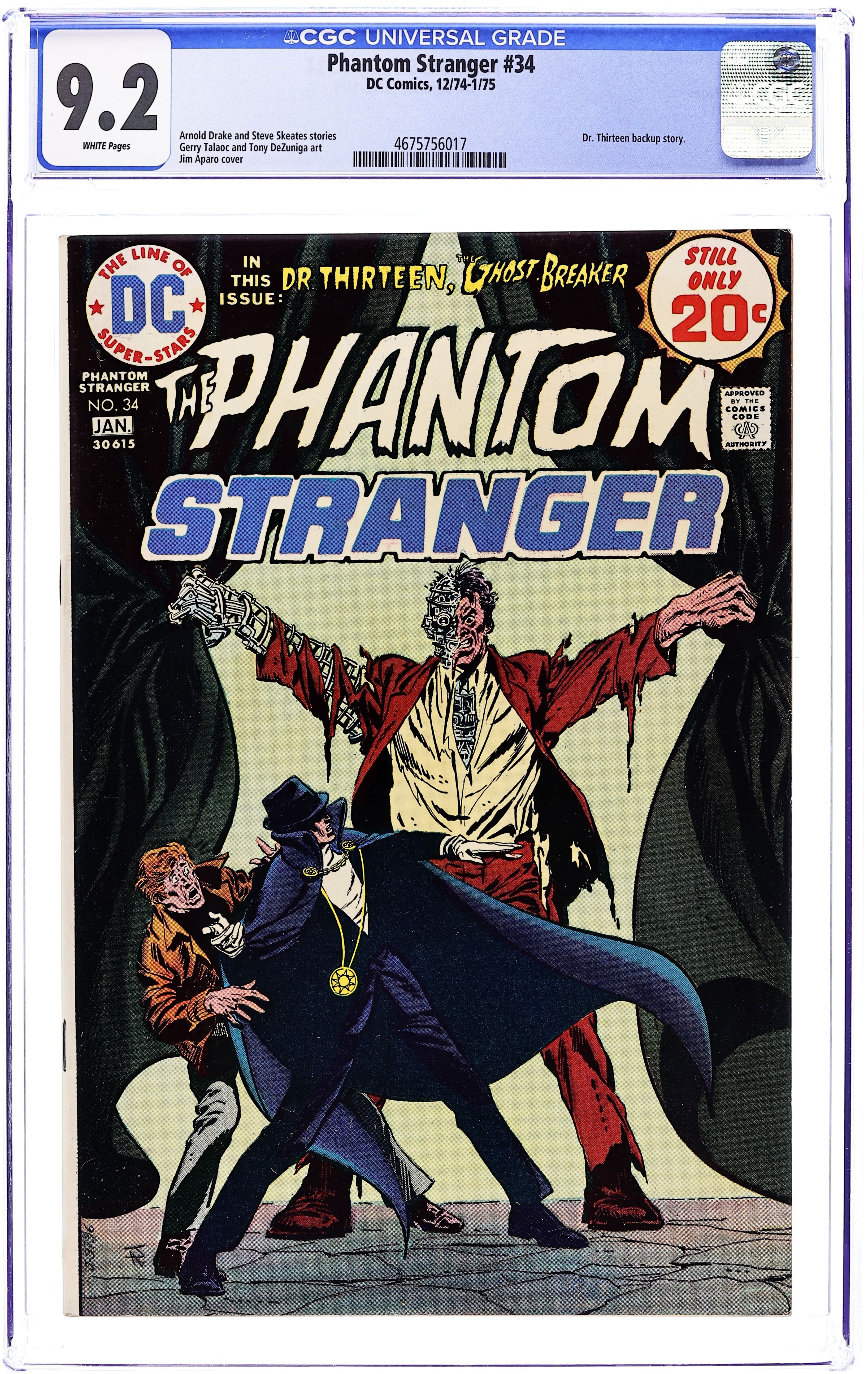 Last 20-cent cover price. Cover art by Jim Aparo. "A Death in the Family!", script by Arnold Drake and Guy Lillian, art by Gerry Talaoc; Following the funeral of Alonzo Barda, a crime boss who was murdered by the Nero Mob, his brother Charlie is uneasy about taking over his brothers business; With the aid of the Phantom Stranger, Charlie learns that his friend Enrico murdered Alonzo and kept his brain alive and connected to a computer to learn how to run the mob and put a robot of Alonzo in place when Charlie refused to get involved in the criminal enterprises of his brother; Discovering the secret and seeing Alonzo's pleas for an end, Charlie sacrifices his life to destroy the computer which has been keeping his brothers brain alive. "And the Dog Howls Through the Night!", script by Steve Skeates, art by Tony DeZuniga; When called in to investigate a haunting, Dr. Thirteen and his wife Marie witness what appears to be a ghost who suddenly appears pleading for help before disappearing; Learning that the owner of the haunted house had mysteriously disappeared, Dr. Thirteen learns that he was a scientist working on an experiment. 36 pgs., full color. Cover price $0.20. Grade: CGC 9.2 explanation of grade Condition: Used (collectible)