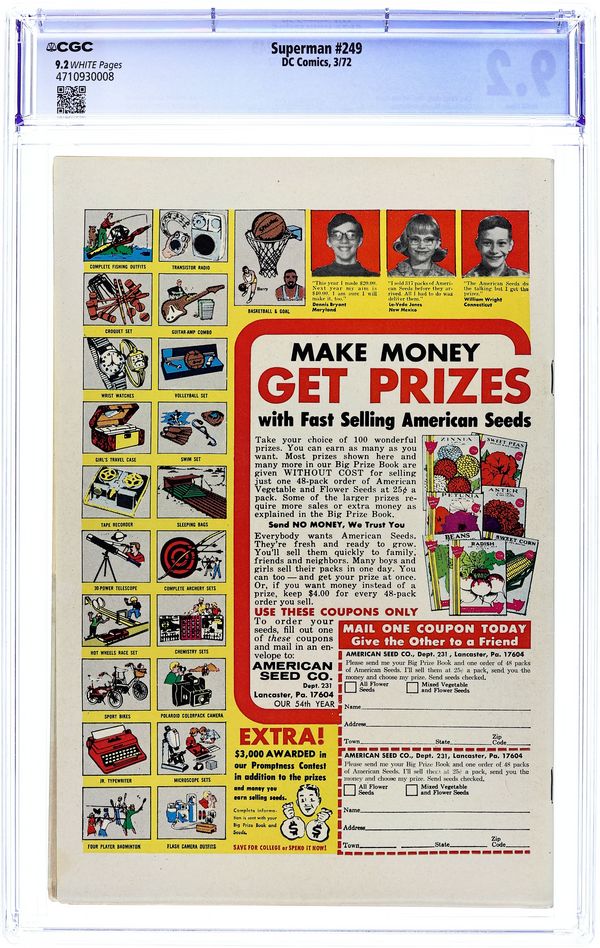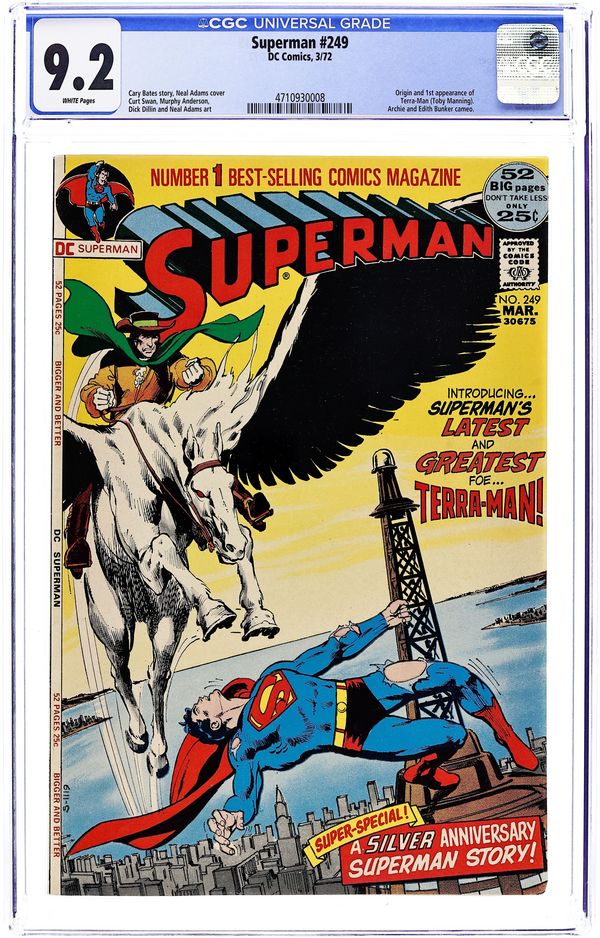 Cover art by Neal Adams. The Challenge of Terra-Man, script by Cary Bates, pencils by Curt Swan, inks by Murphy Anderson; The appearance of a stagecoach on the streets of Metropolis heralds the arrival of Terra-Man, a character seemingly from a spaghetti western, yet with super-scientific weapons. The Origin of Terra-Man, script by Cary Bates, pencils by Dick Dillin, inks by Neal Adams. High Man on a Flagpole! starring Superman, script by Jerry Siegel, art by John Sikela. 52 Pages, Full Color. Cover price $0.25. Grade: CGC 9.2 explanation of grade Condition: Used (collectible)