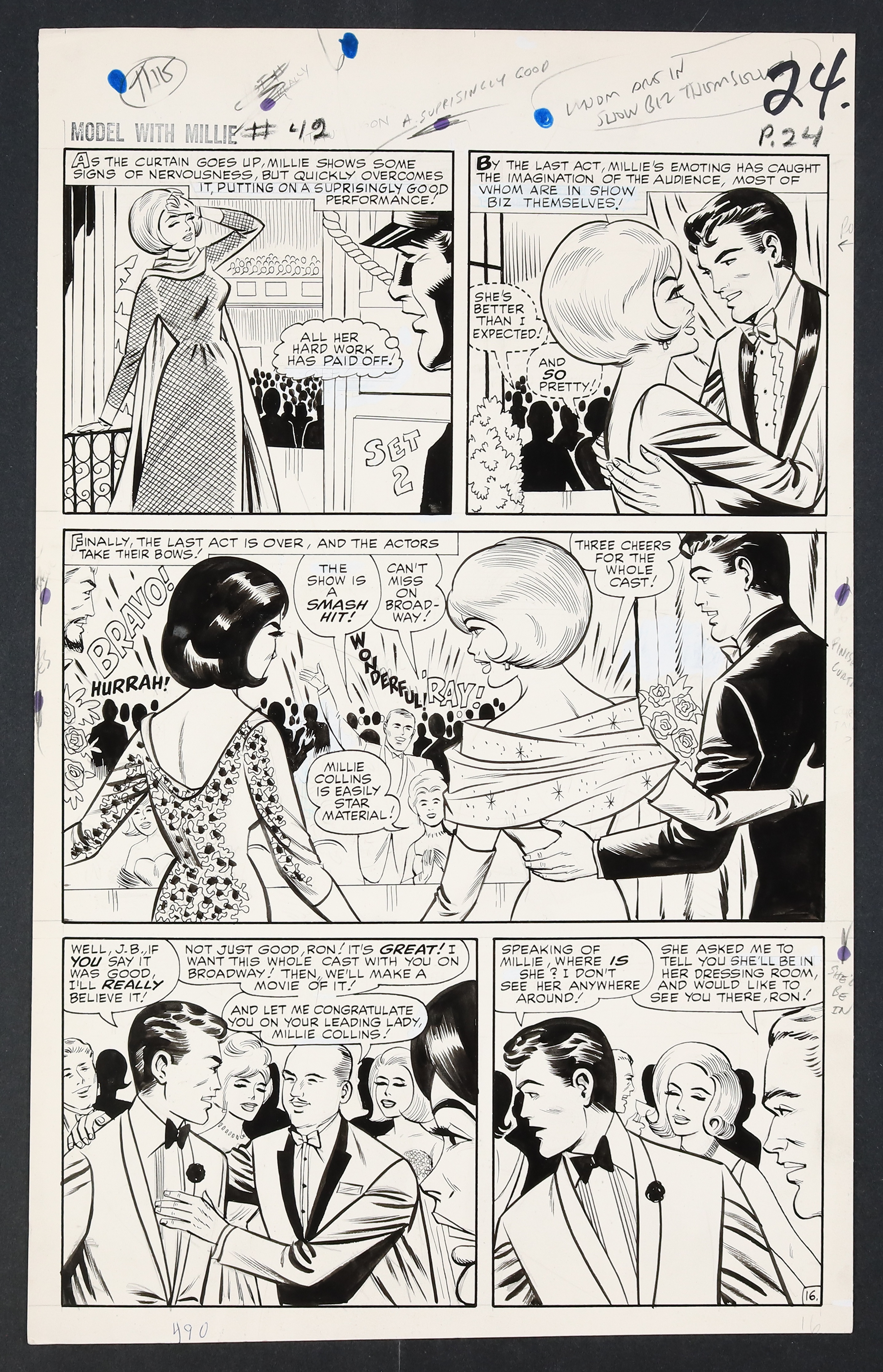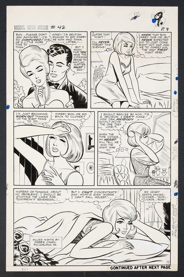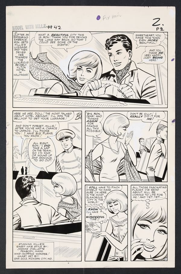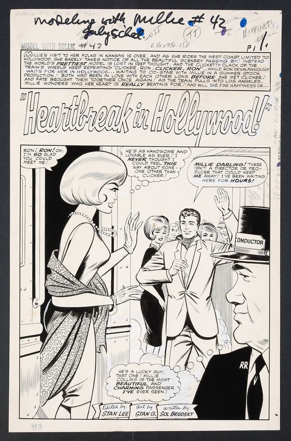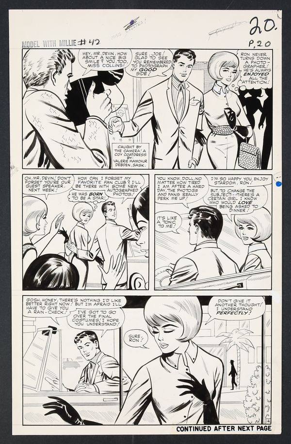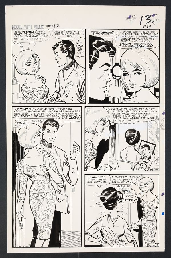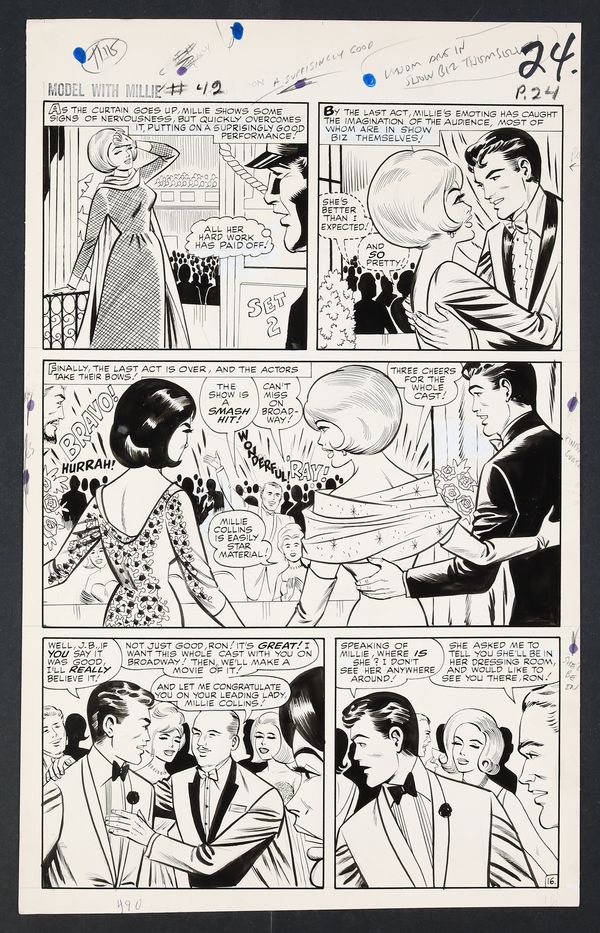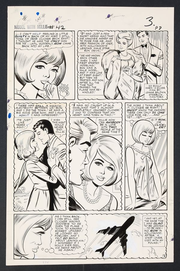 Millie's looking so right in her diamonds and frills on this California night as she heads to Hollywood to try her hand at acting! An especially glamorous issue, Millie finds herself torn not just between acting and modeling, but between leading man Ron Devin and Clicker back home in New York. Pencil and ink on 18 pages of art board which measure approximately 13 3/4" x 21 1/2".