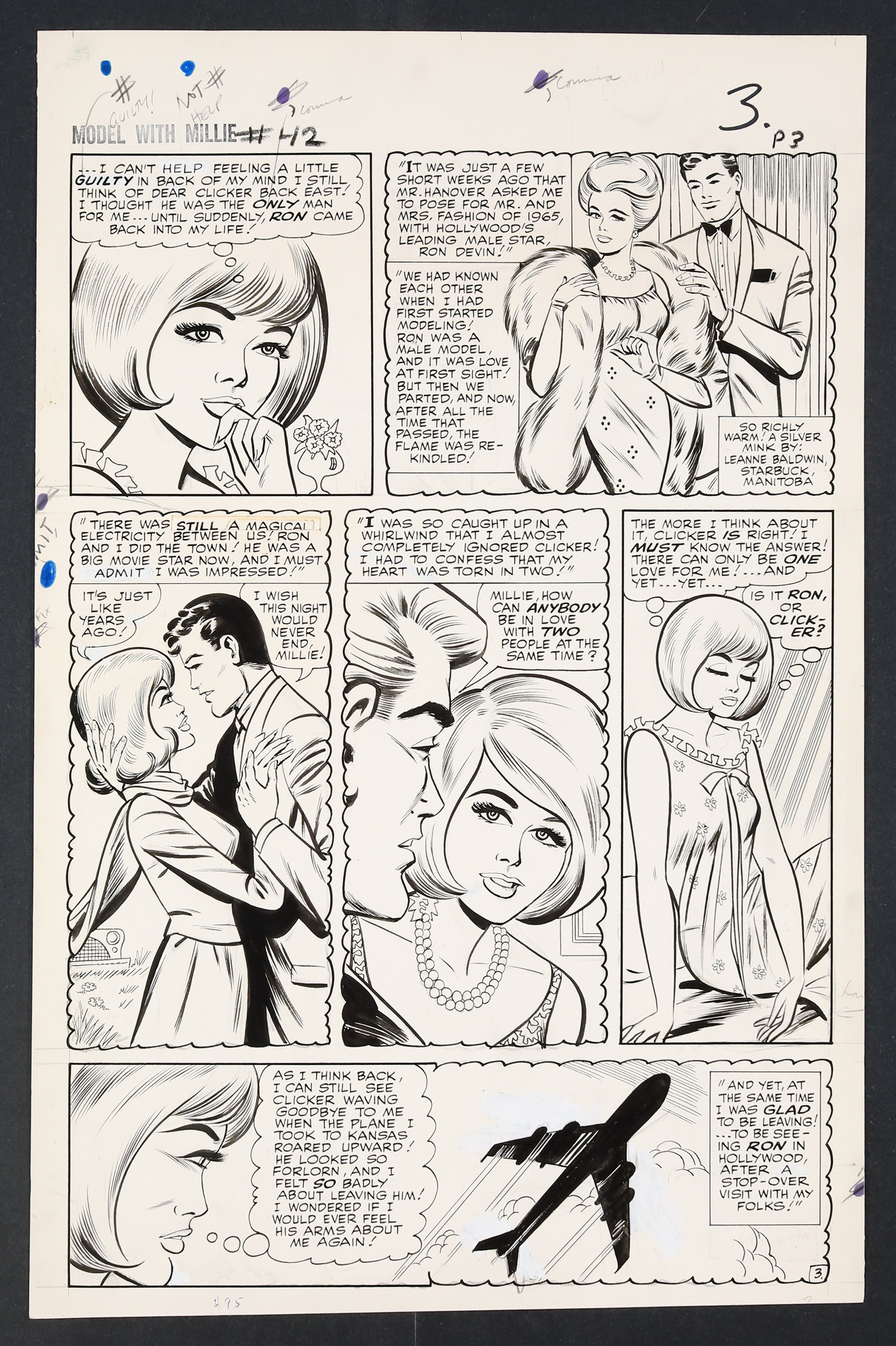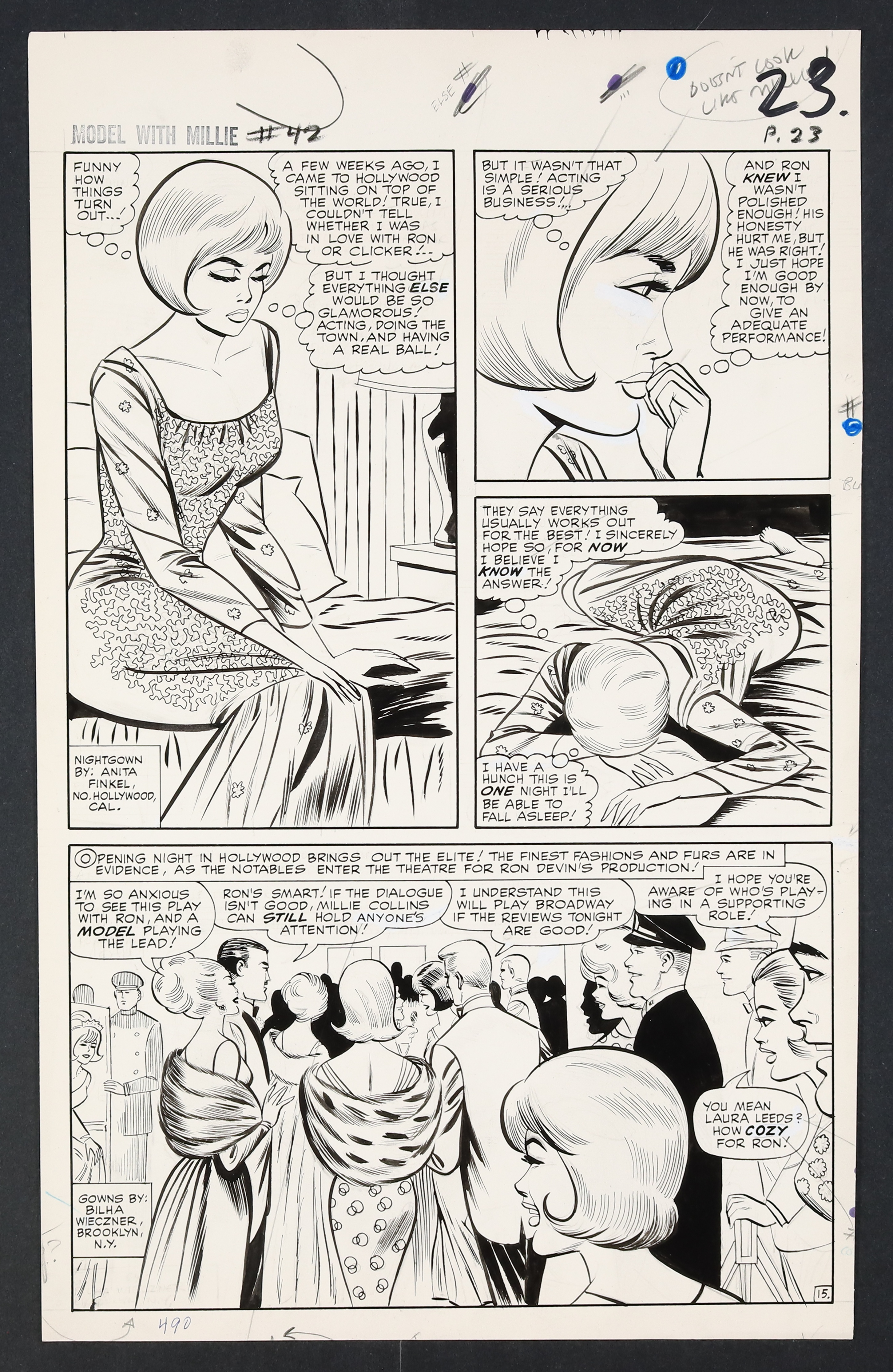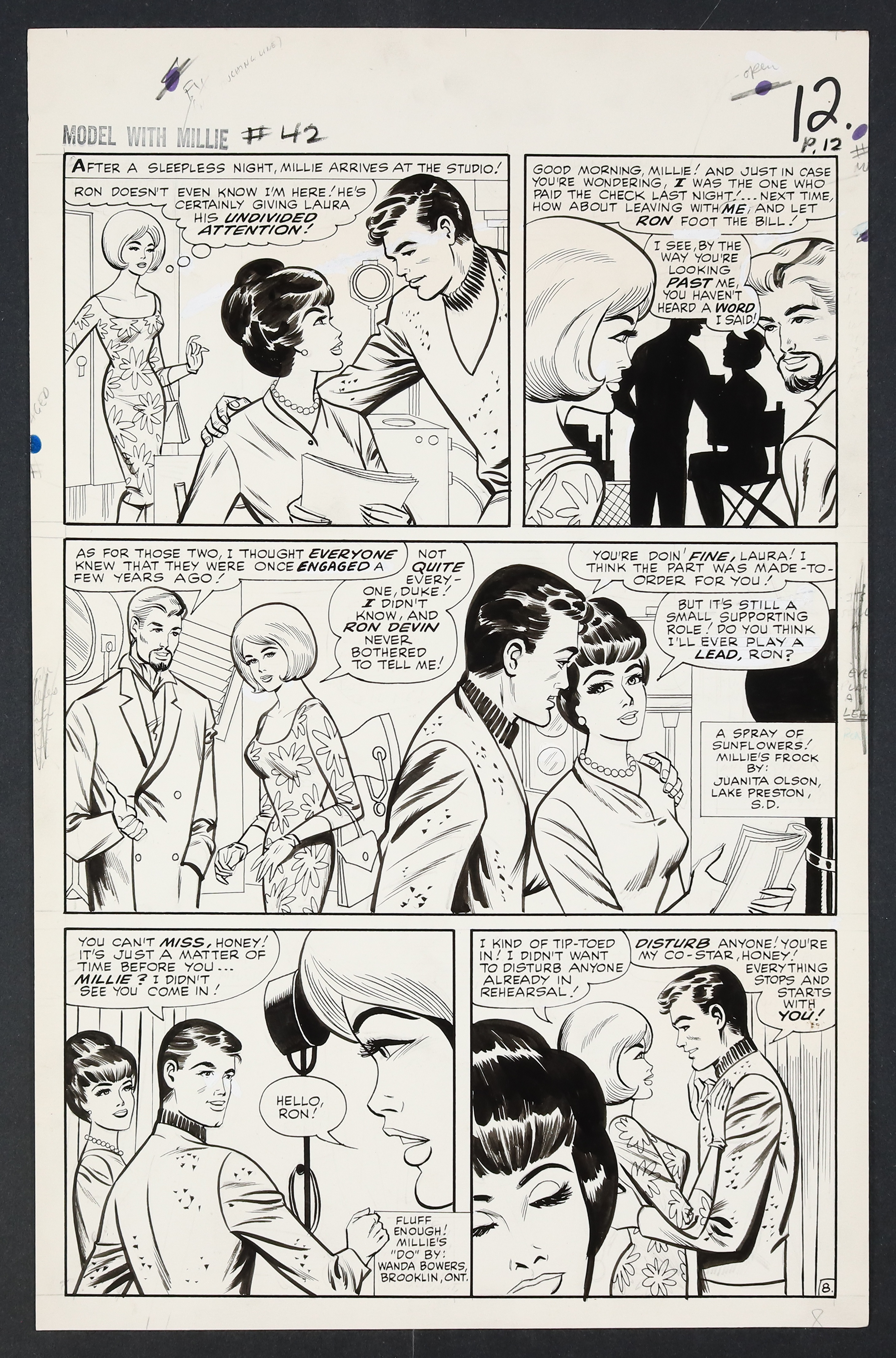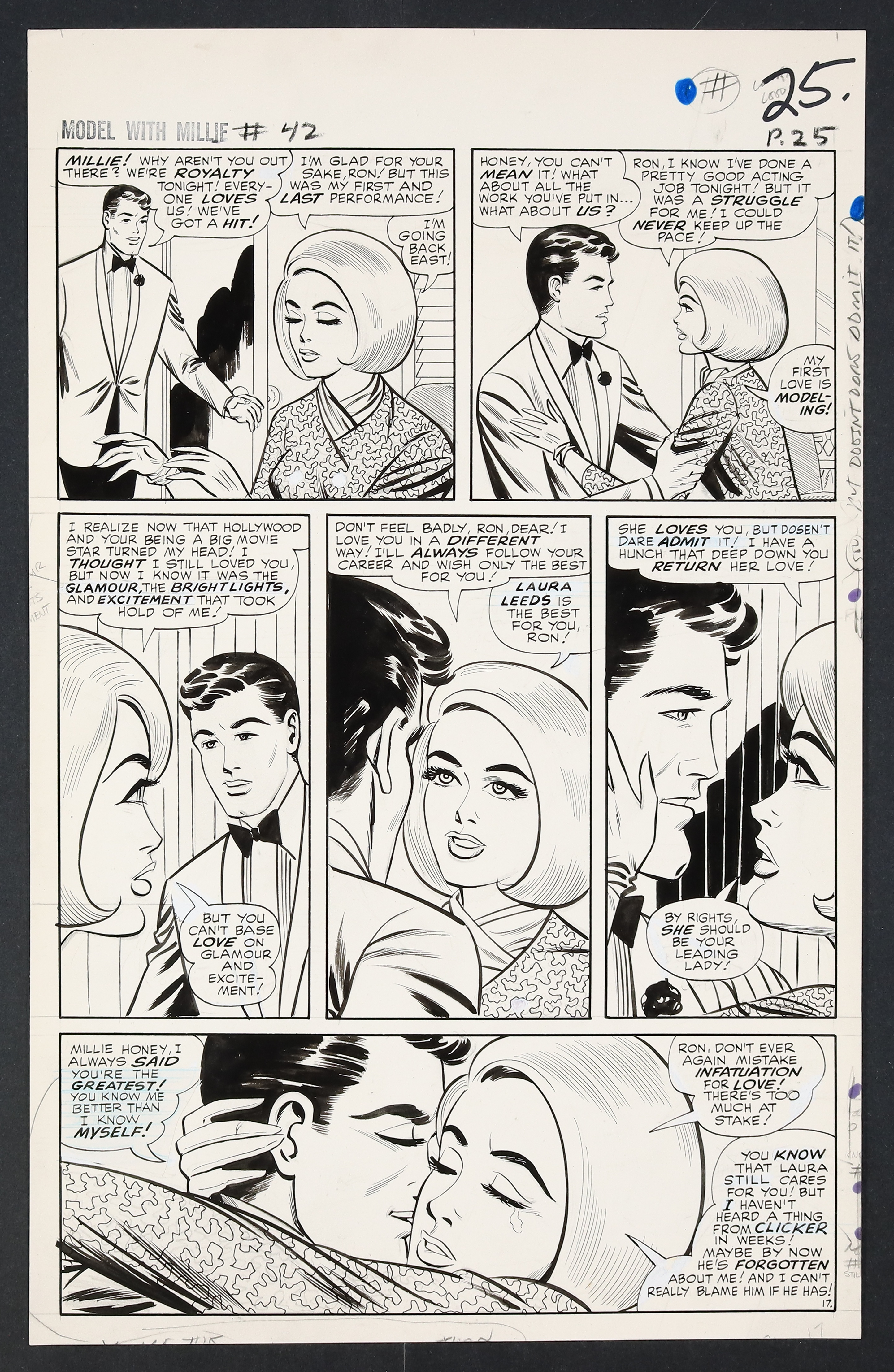 Millie's looking so right in her diamonds and frills on this California night as she heads to Hollywood to try her hand at acting! An especially glamorous issue, Millie finds herself torn not just between acting and modeling, but between leading man Ron Devin and Clicker back home in New York. Pencil and ink on 18 pages of art board which measure approximately 13 3/4" x 21 1/2".