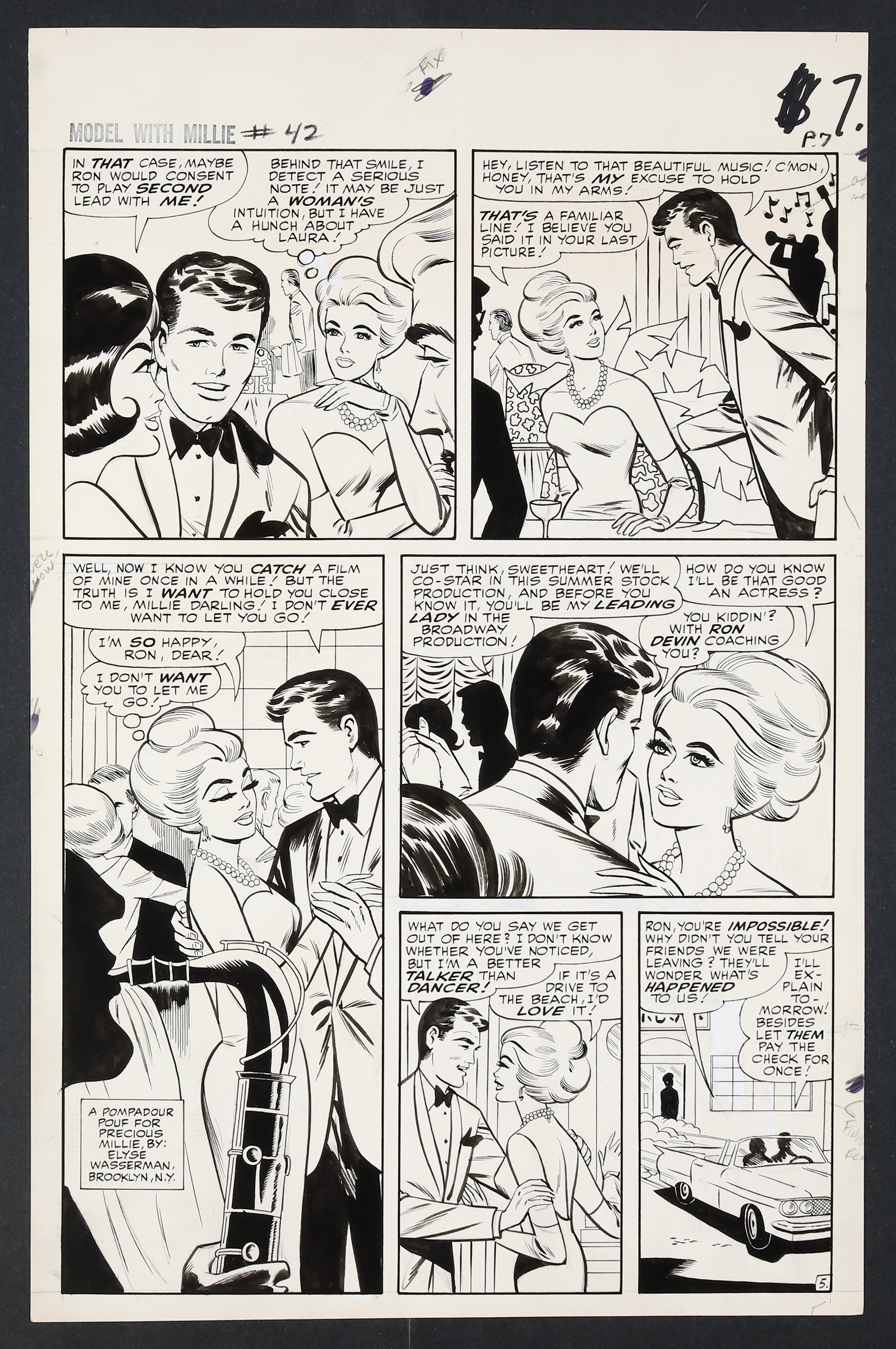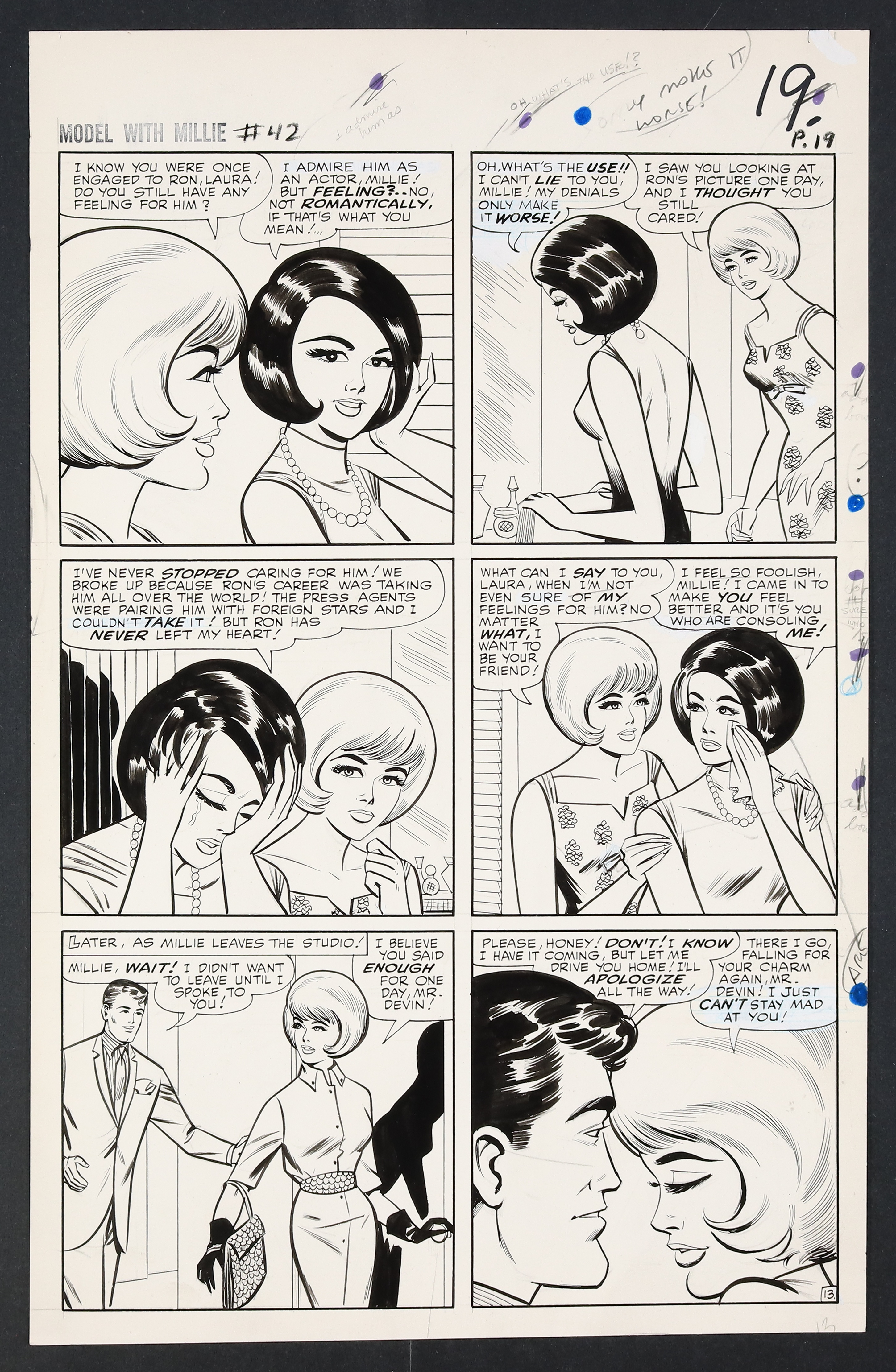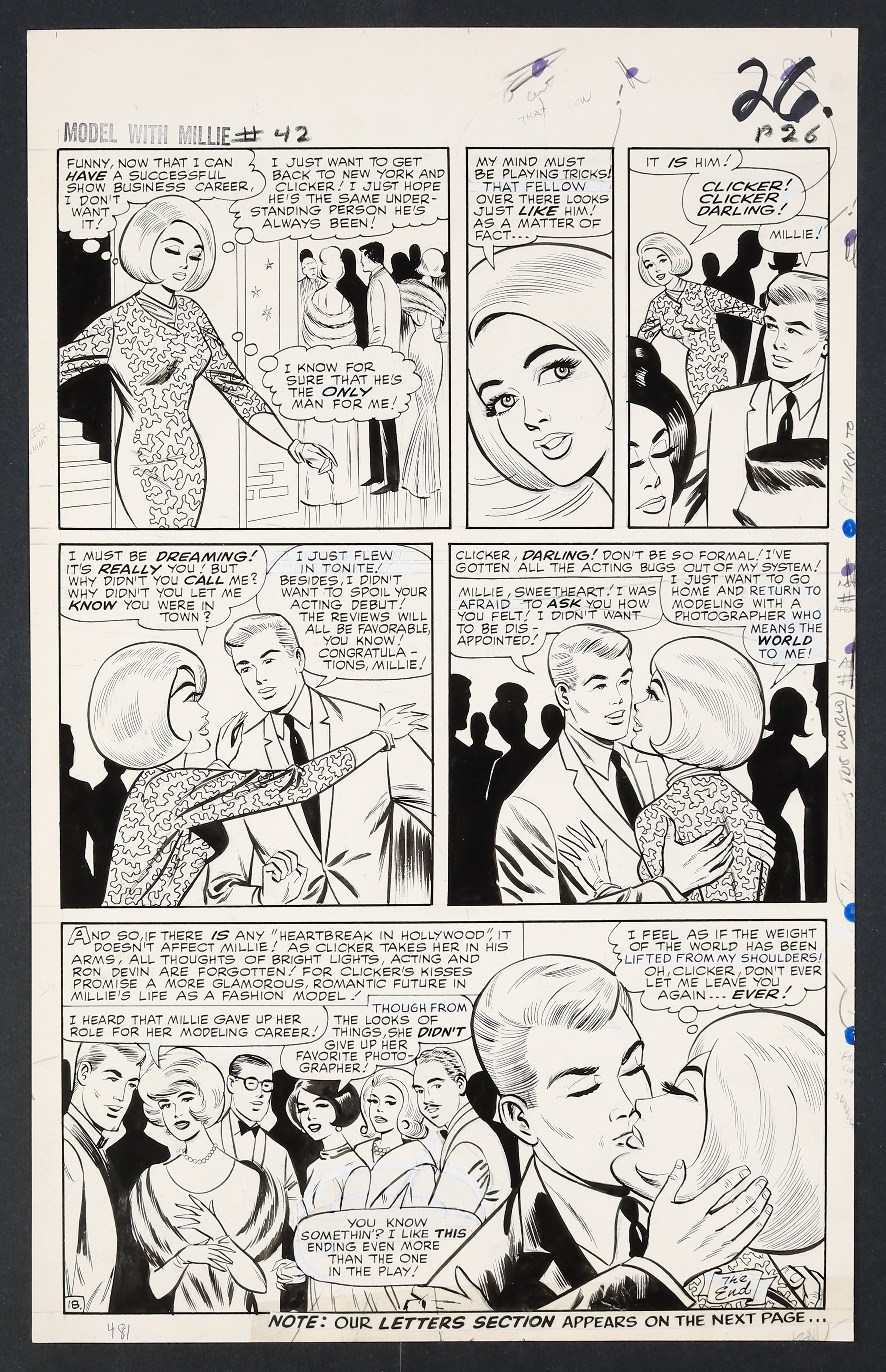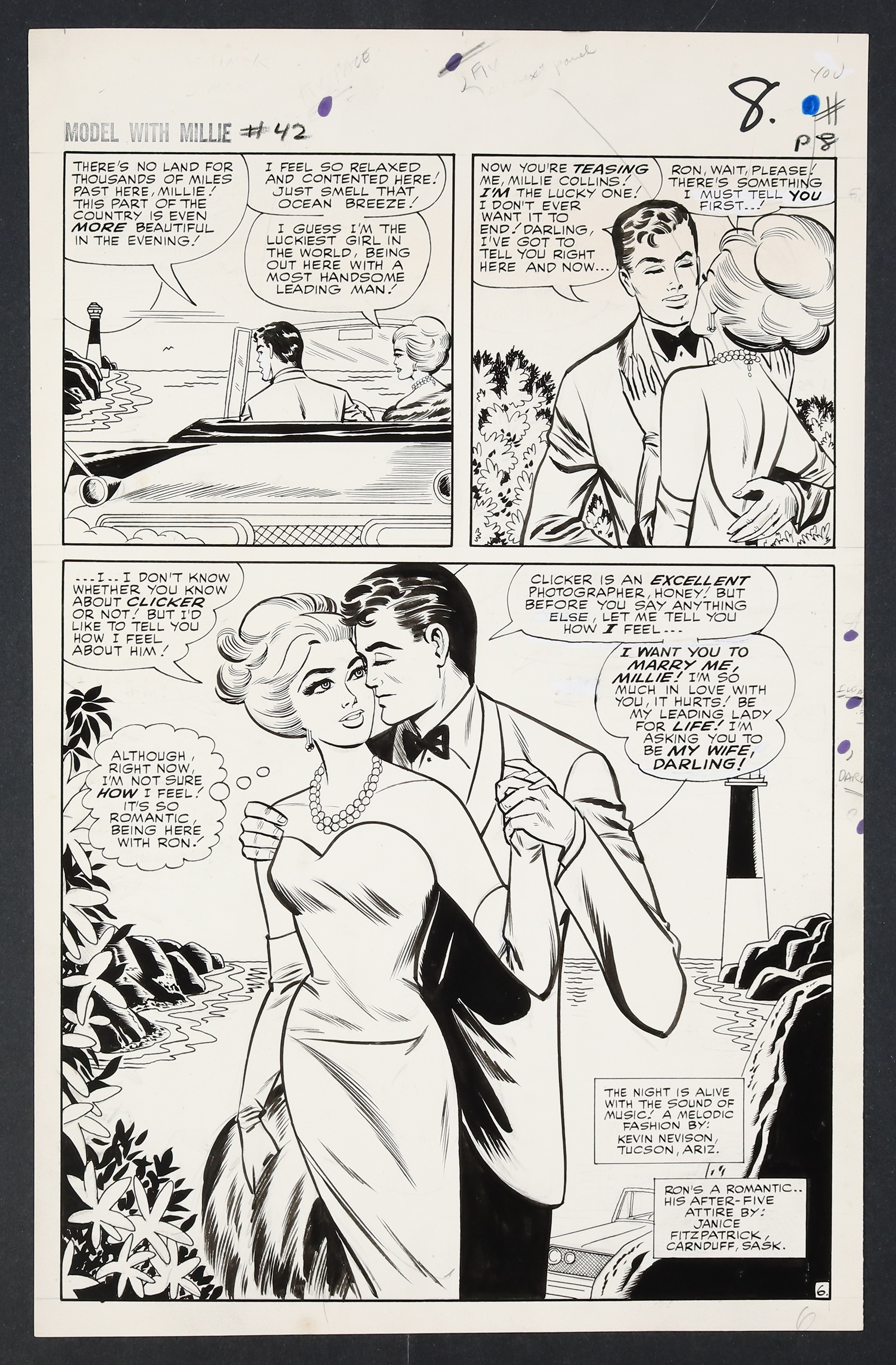 Millie's looking so right in her diamonds and frills on this California night as she heads to Hollywood to try her hand at acting! An especially glamorous issue, Millie finds herself torn not just between acting and modeling, but between leading man Ron Devin and Clicker back home in New York. Pencil and ink on 18 pages of art board which measure approximately 13 3/4" x 21 1/2".