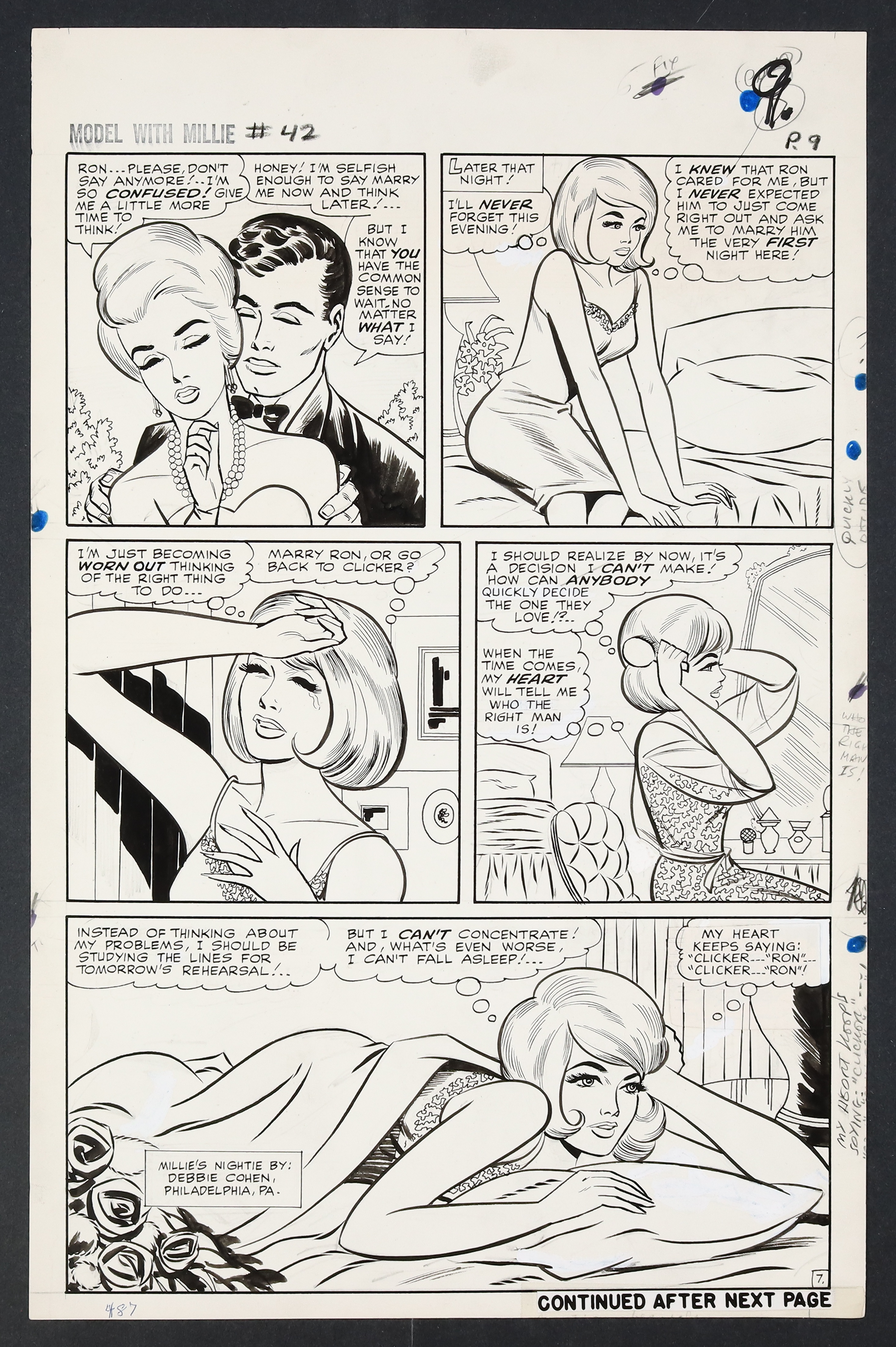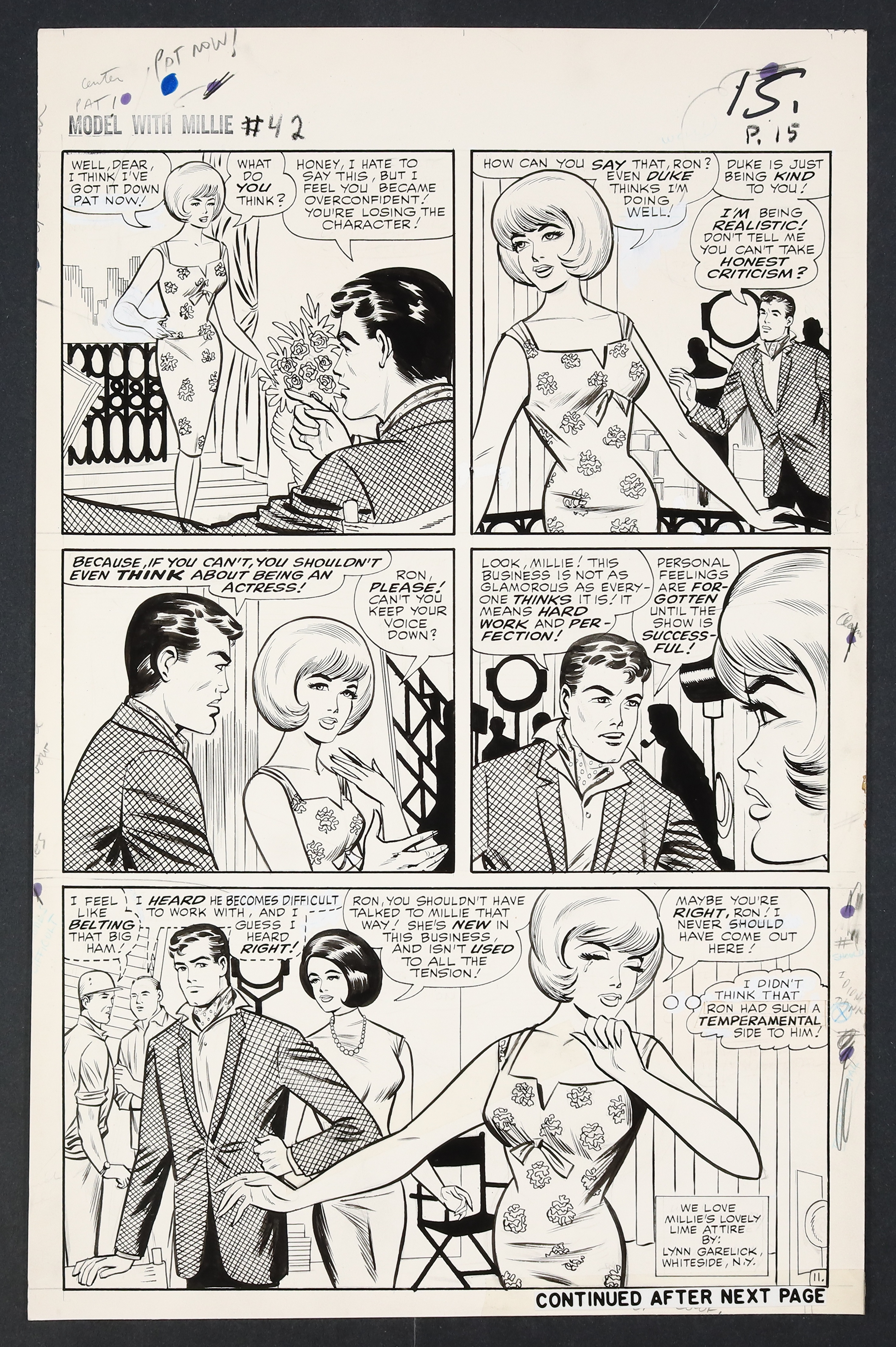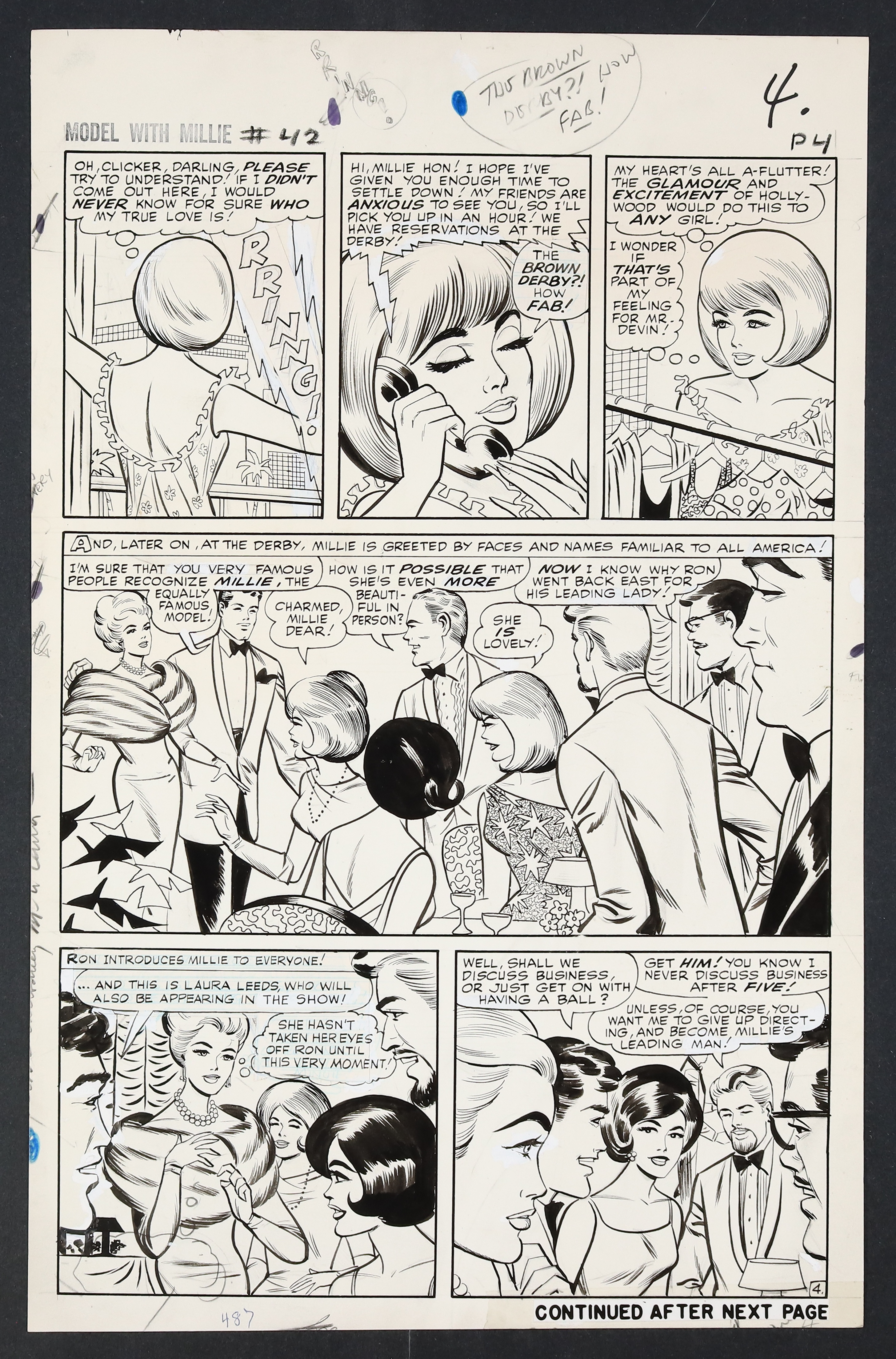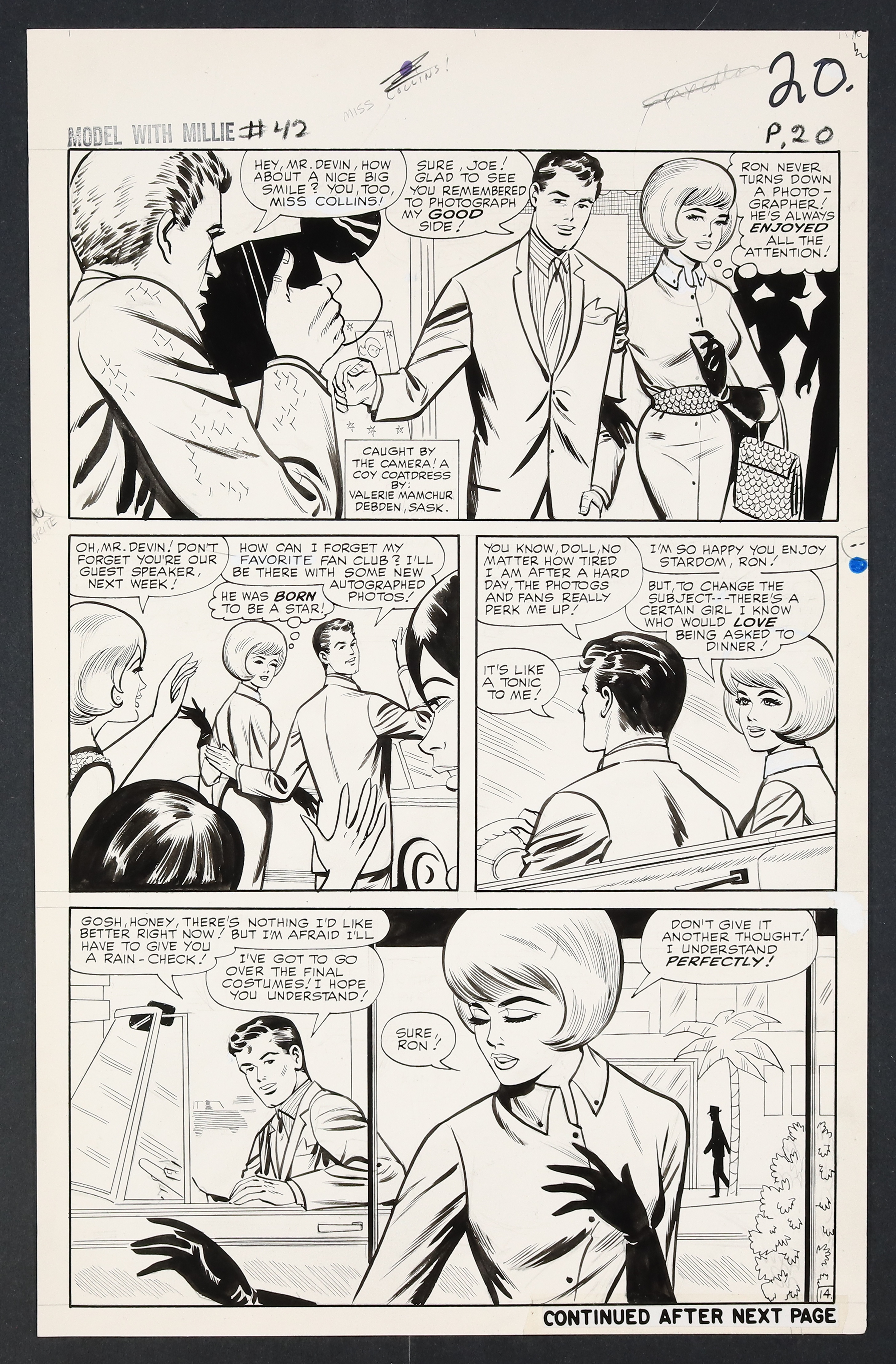 Millie's looking so right in her diamonds and frills on this California night as she heads to Hollywood to try her hand at acting! An especially glamorous issue, Millie finds herself torn not just between acting and modeling, but between leading man Ron Devin and Clicker back home in New York. Pencil and ink on 18 pages of art board which measure approximately 13 3/4" x 21 1/2".
