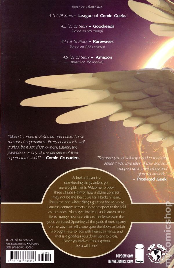 Volume 3 - 1st printing. Story and art by Stjepan Sejic. In Volume 3 of FINE PRINT (aka "Why sex with gods is NOT a good idea"), we dive in deep and discover that not all winged things are angels, not all horned ones bring damnation, and surprise-surprise, no amount of unbridled bliss can actually solve your problems. Like any painkiller, bliss only takes you so far. This is a lesson that unlucky-in-love Lauren Thomas is going to have to learn the hard way, despite the aid of some of the underworld's foremost incubi. Even in Lauren's unique position - having divine entities at your romantic beck and call - wrestling with the past is no one's idea of a good time. Not that things are any easier for the immortals in Lauren's orbit; whether you execute contracts or shoot heart-shaped arrows, interpersonal dynamics always end up complicating things. Softcover, 208 pages, full color. Mature Readers Cover price $19.99.