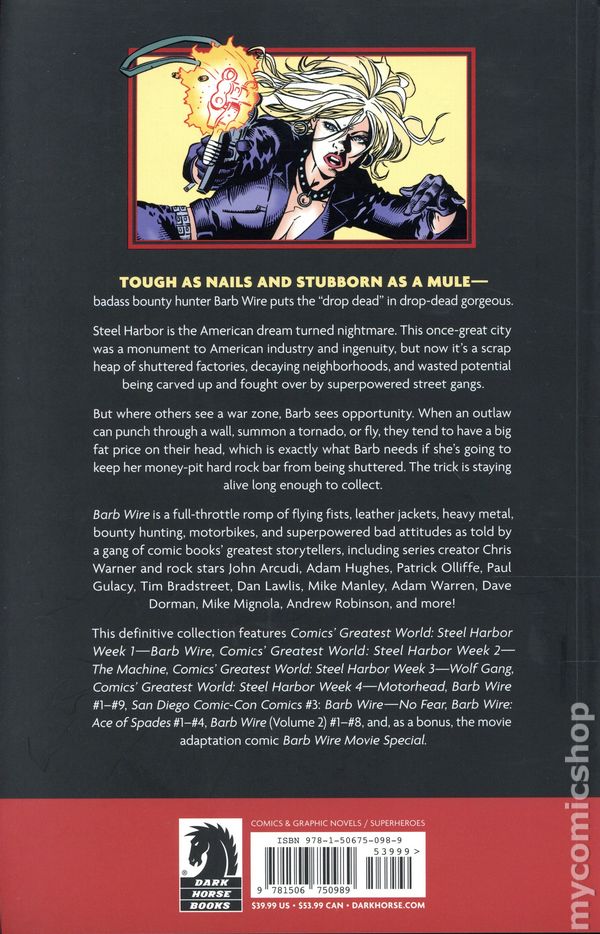 1st printing. Collects Stories from Comics' Greatest World: Barb Wire (1993), Comics' Greatest World The Machine (1993), Comics' Greatest World Wolf Gang (1993), Comics' Greatest World Motorhead (1993), Barb Wire (1994) #1-9, San Diego Comic-Con Comics (1992-1995) #3: Barb Wire: No Fear, Barb Wire: Ace of Spades (1996) #1-4, Barb Wire (2015 Dark Horse) #1-8, and Barb Wire Movie Special (1996). Written by John Arcudi, Chris Warner, and Sarah Byam. Art by Lee Moder, Ande Parks, Chris Warner, Tim Bradstreet, Pat Olliffe, Tom Nguyen, Gordon Purcell, Jeff Albrecht, Brian Garvey, Terry Pallot, and Gary Martin. Cover by Adam Hughes. Back Cover by Chris Warner. Tough as nails and stubborn as a mule—badass bounty hunter Barb Wire puts the drop dead in drop dead gorgeous.Steel Harbor is the American dream turned nightmare. This once great city was a monument to American industry and ingenuity, but now its a scrap heap of shuttered factories, decaying neighborhoods, and wasted potential being carved up and fought over by superpowered street gangs. But where others see a warzone, Barb sees opportunity. When a bounty can punch through a wall, summon a tornado, or fly, they tend to have a big fat price on their head which is exactly what Barb needs if shes going to keep her money-pit hard rock bar from being shuttered. The trick is staying alive long enough collect. Barb Wire is a full-throttle romp of flying fists, leather jackets, heavy metal, bounty hunting, motor bikes, and super-powered bad attitudes as told by a gang of comic books greatest storytellers including series-creator Chris Warner and rockstars John Arcudi, Adam Hughes, Patrick Oliffe, Paul Gulacy, Tim Bradstreet, Dan Lawliss, Mike Manley, Adam Warren, Dave Dorman, Mike Mignola, Andrew Robinson, and more! Softcover, 648 pages, full color. Mature Readers Cover price $39.99.