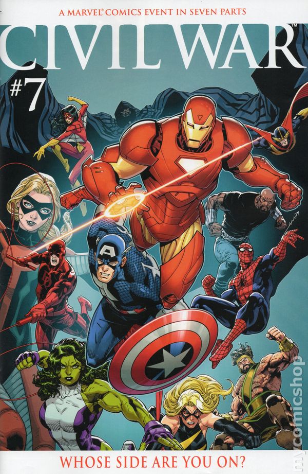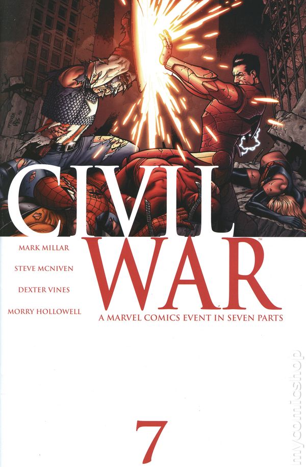 (W) Mark Millar (A) Steve McNiven (CA) Steve McNiven The Facsimile re-presentation of the blockbuster crossover that scarred the Marvel Universe for years reaches its shocking climax! The Superhuman Registration Act has split the world's heroes down the middle, with the law-abiding Iron Man leading one side and the renegade Captain America the figurehead for civil liberties! Allegiances have formed, changed, even shattered - but now, at last, the resistance movement has made its final stand, launching an attack on the pro-registration faction's holding facility in the Negative Zone. But Tony Stark and his forces are lying in ambush, and the final battle begins that will define the future for all costumed vigilantes! It's one of the all-time great Marvel comic books, boldly re-presented in its original form, ads and all! Reprinting CIVIL WAR (2006) #7. Marvel will be reprinting the original seven issues of Civil War! 40 pages, full color, rated T+. Cover price $6.99.