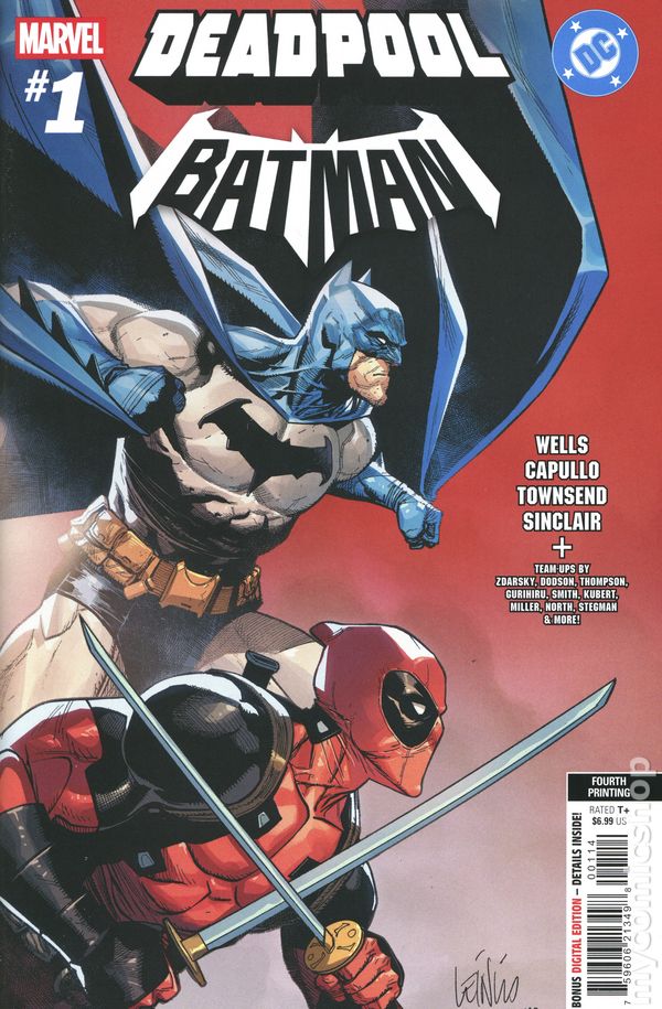 4th Printing. Limited 1 for 25 Retailer Incentive Variant Cover. Written by Al Ewing, Ryan North, Kevin Smith, Kelly Thompson, Zeb Wells, and Chip Zdarsky. Art by Greg Capullo, Terry Dodson, G Gurihiru, Adam Kubert, Dike Ruan, Ryan Stegman. Cover by Ryan Stegman The crossover you've pined for but never thought possible: DEADPOOL and BATMAN cross swords and batarangs as MARVEL and DC unite for the first time in decades! WADE WILSON has been hired for a job in GOTHAM CITY, but will the WORLD'S GREATEST DETECTIVE help him or destroy him? The one-shot will also feature additional backup stories spotlighting other exciting Marvel and DC team-ups from a lineup of all-star talent, including Daredevil and GREEN ARROW by Kevin Smith and Adam Kubert, Captain America and Wonder Woman by Chip Zdarsky and Terry Dodson, and Jeff the Land Shark and Krypto by Kelly Thompson and Gurihiru. 64 pages, rated T+ Cover price $6.99.
