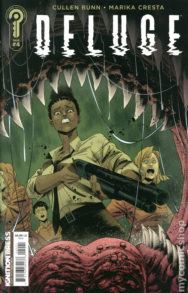 (W) Cullen Bunn (A) Marika Cresta (CA) Marika Cresta (C) Ronda Pattison The rain continues to fall, and the corridors continue to flood, bringing more monsters into the prison. The surviving guards and inmates are starting to realize, however, that the deadliest threat they are facing is themselves. If the infighting doesn’t get them, then the sins of their past will. When faced with the spectral embodiments of their crimes, some of the women would rather perish in the jaws of the evil creatures that are hunting them. Can Maggie lead one last push to find an escape before it’s too late?Deluge reaches its penultimate issue, as writer Cullen Bunn (Harrow Country, Deadpool Destroys the Marvel Universe) and artist Marika Cresta (Star Wars: High Republic) open the floodgates of fear! 32 pages rated T+, full color Cover price $4.99.