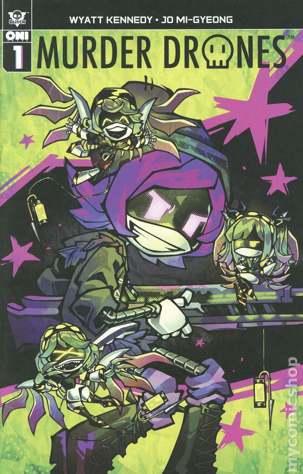 Limited 1 for 100 Retailer Incentive Variant Cover. (W) Wyatt Kennedy (A) Jo Mi-Gyeong (CA) LySandra Vuong Based on Glitch Productions' global animation phenomenon created by Liam Vickers and now streaming on Prime Video, it's three cheers for 'destroy all humans' as all-star creators Wyatt Kennedy (Nights, Marvel Voices) and Jo Mi-Gyeong (Eve, The Dark Crystal: Age of Resistance) unleash the record-setting comics adaptation of the series that you have watched 330 million times: MURDER DRONES! In the far future on the desolate exoplanet designated Copper 9, the humans are long gone but the robotic worker drones they created to mine the planet's resources are still hard at work. Together, they have managed to forge their own makeshift society . . . or so they thought until a previously unknown kind of robot—the dreaded 'Murder Drones'—are activated by a long-forgotten human-scripted protocol to disassemble any worker that deviates from its original programming. But when a rebellious young worker drone named Uzi forms an unlikely alliance with two disassembly drones—Serial Designations N and V—can they, together, uncover the secrets of their origins . . . and stop the spread of the unsettling mechanical virus known as the Absolute Solver? Robots, violence, teen angst, mad science, love, loss, doors, hormones, and chaos! What more could you ask for? A pen, perhaps? It's a clicky pen! (Ask your kids. They'll get it!) Cover price $4.99.