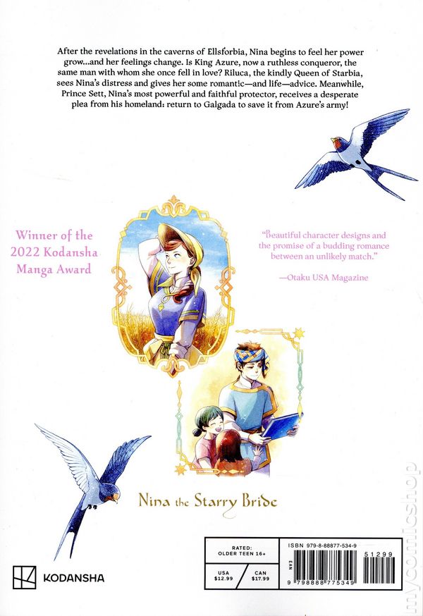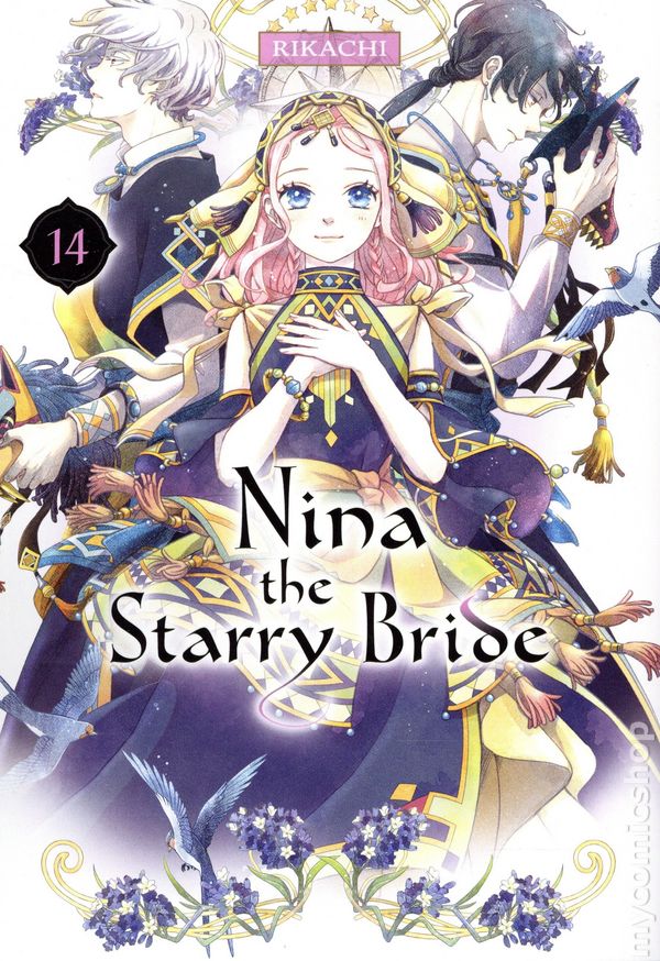 Volume 14 - 1st printing. Story and art by RIKACHI. Nina was plucked off the streets because she resembled a dead priestess--but is this a lucky break, or a new kind of curse? Winner of the Kodansha Manga Award, this fantasy shojo manga features intertwining constellations of palace intrigue and perilous romance, for fans of The Ancient Magus' Bride, The Apothecary Diaries, and Snow White With the Red Hair. Nina had a rough start to life, orphaned and stealing to survive, only to be abducted for her unusual lapis lazuli eyes. But to her surprise, her captor, Prince Azure, ordained that she would live the life of a princess...specifically, that of the recently deceased princess-priestess, Alisha, who had her same eyes. Despite her changing fortune, Nina won't give up her old life without a fight. Azure might just be the one to finally match her wits, but how much can she trust him? And can she stop the feelings budding in her heart, knowing she must eventually marry another...? Softcover, 5 1/2-in. x 7-in., 176 pages, B&W. Older Teen (16+) Cover price $12.99.