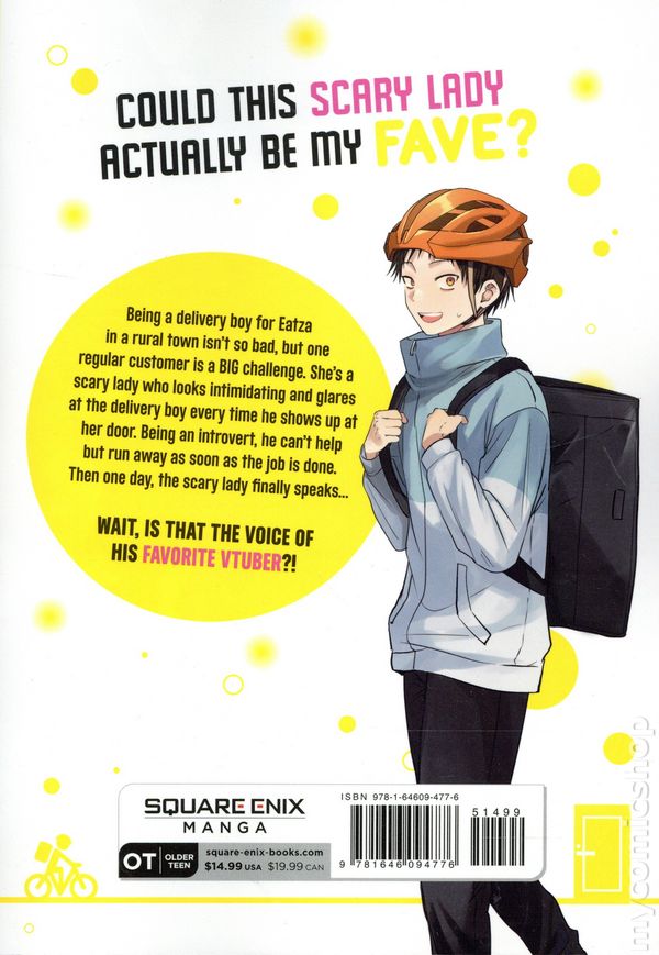 Volume 1 - 1st printing. Story and art by Riyo Yorima. Translated by Caleb Cook. An introverted delivery boy befriends a shy but intimidating shut-in who happens to be his favorite VTuber IRL! Being a delivery boy for Eatza in a rural town isn't so bad, but one regular customer is a BIG challenge. She's a scary lady who looks intimidating and glares at the delivery boy every time he shows up at her door. Being an introvert, he can't help but run away as soon as the job is done. But one day, the scary lady finally speaks... Wait, is that the voice of his favorite VTuber?! Softcover, 5 1/2-in.x 7-in., 144 pages, B&W. Older Teen Cover price $14.99.