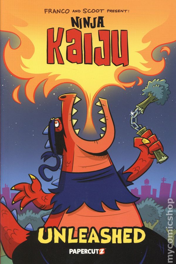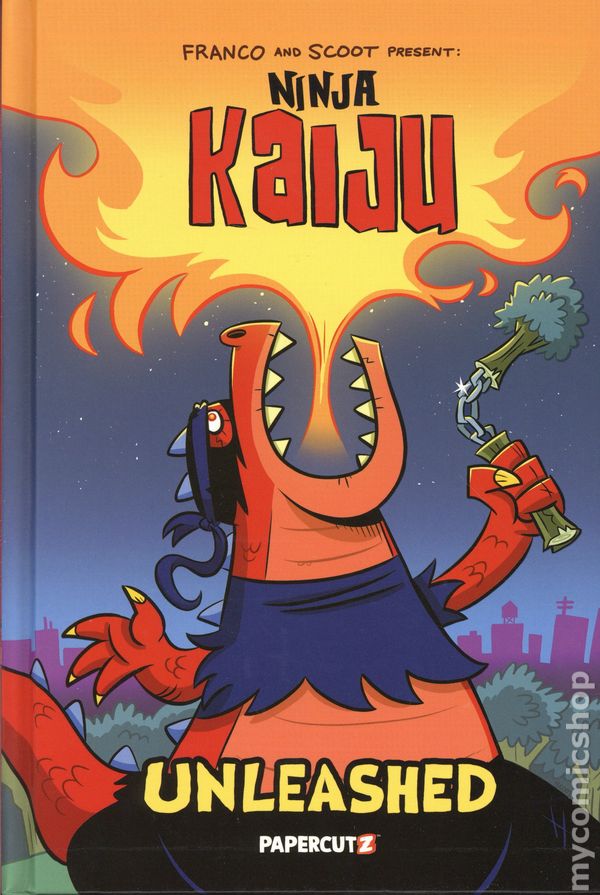 Volume 1 - 1st printing. "Unleashed!" Written by Franco. Art and cover by Scott SCOOT McMahon. What happens when you hire a Ninja to steal a secret formula? What happens when that formula is held in a top secret state of the art high security science lab? What happens when that ninja accidentally gets splashed with the secret formula? Well... all of those questions are probably related and answer the question: Where did that giant Kaiju monster suddenly come from? The life of a Ninja isn't easy, with all the stealth sneaking, high kicks, and the other Ninjaery things that need to be done. Now throw in a secret formula that turns you into a big city destroying monster and suddenly you're not so stealthy any more. The job gets even more difficult when you have not one, but two super smart mad scientist after you because they think you stole their formula and send hordes of robots, the air force, and other never before seen science experiments after you. It may no longer be just a job for a Ninja, but it definitely is for a NINJA KAIJU! Hardcover, 6-in. x 9-in., 136 pages, full color. All Ages Cover price $17.99.
