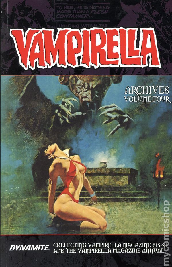 Volume 4 - 1st printing. Collects Vampirella (1969-1988 Magazine) #22-28 and Vampirella (1972 Warren) Annual #1972. Written by Donald Glut, Bill DuBay, Doug Moench, Steve Englehart, Len Wein, J.R. Cochran, Esteban Maroto, Dube, Steve Skeates, John Jacobson, Ed Newsome, Kevin Pagan, Gerry Bourdeau, Jim Stenstrum, Robert Rosen, Nicola Cuti, W. Eaton, George Henderson, James Crawford, Lynn Marron, Jose Marron, Jose Toutain, Flaxman Loew, Fernandez, Jose Bea, and Bruce Bezaire. Art by Jose Gonzalez, Esteban Maroto, Auraleon, Dube, Jose Bea, Felix Mas, Ramon Torrents, Munes, and Fernandez. Cover by Enrique Torres. Back Cover by Jose Gonzalez. ONE FROM THE VAULTS! Dynamite continues to expand its archival library with all-new trade paperback editions showcasing Vampi's early adventures from the pages of Vampirella Magazine! This fourth volume of the Vampirella Archives epitomizes vintage horror at its finest, reprinting such classic tales as What Price Love, Nimrod, Demons in the Fog, and The Blood Queen of Bayou Parish! Showcasing a wealth of work from such acclaimed creators as Archie Goodwin, Steve Englehart, José Gonzalez, Esteban Moroto, Len Wein, Doug Moench, and many others, The Vampirella Archives Volume Four trade paperback collects issues #22-28 and the Vampirella 1972 Annual from the magazines original run, all enclosed by an iconic cover by artist Enrique Enrich Torres. Softcover, 400 pages, PC/PB&W. Teen+ Cover price $34.99.